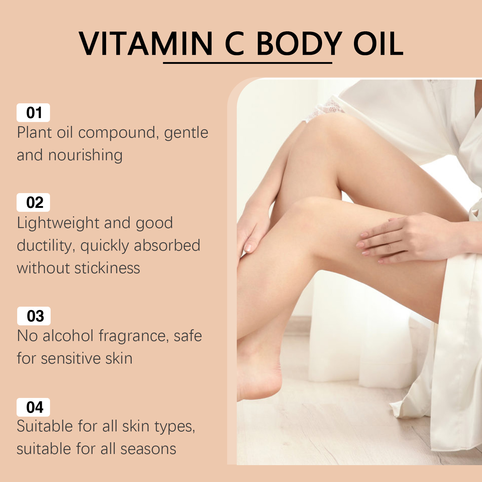 Our vitamin C softening oil is carefully formulated with vanilla fruit extract and bergamot oil. Designed specifically to reduce oxidative damage and help brighten the complexion. The usage method is extremely convenient: After taking a bath, apply an appropriate amount to your palm, rub it warm and then use it. Apply evenly to dry areas such as the joints of the limbs, massage in circular motions until fully absorbed, and focus on massaging rough areas. And it can be mixed with body lotion to enhance the moisturizing effect.
