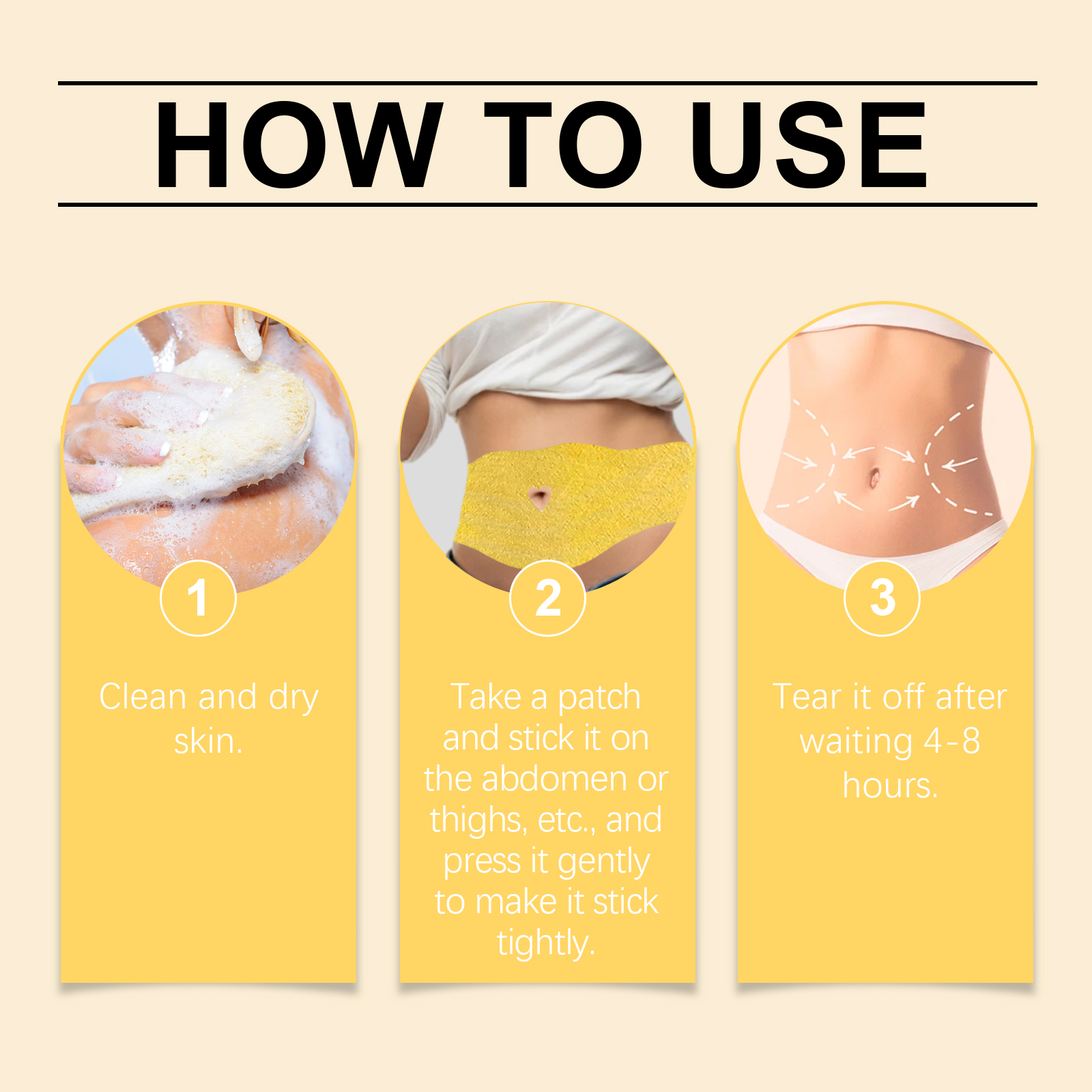 Our body shaping strips contain purslane extract, camellia extract and capsicum fruit extract. It can activate local blood circulation and accelerate fat burning, directly targeting the fat site. Promote body metabolism, regulate lipid balance, effectively convert excess energy. Its use is simple: 1. Clean and dry the skin. 2. Apply a patch to the abdomen or thigh, etc., and gently press it to keep it tight. 3. Wait 4-8 hours before tearing off. Body Shaping Patch is rich in firming ingredients to improve skin elasticity and reshape body lines. Improve your confidence, express yourself, and get your ideal body easily.