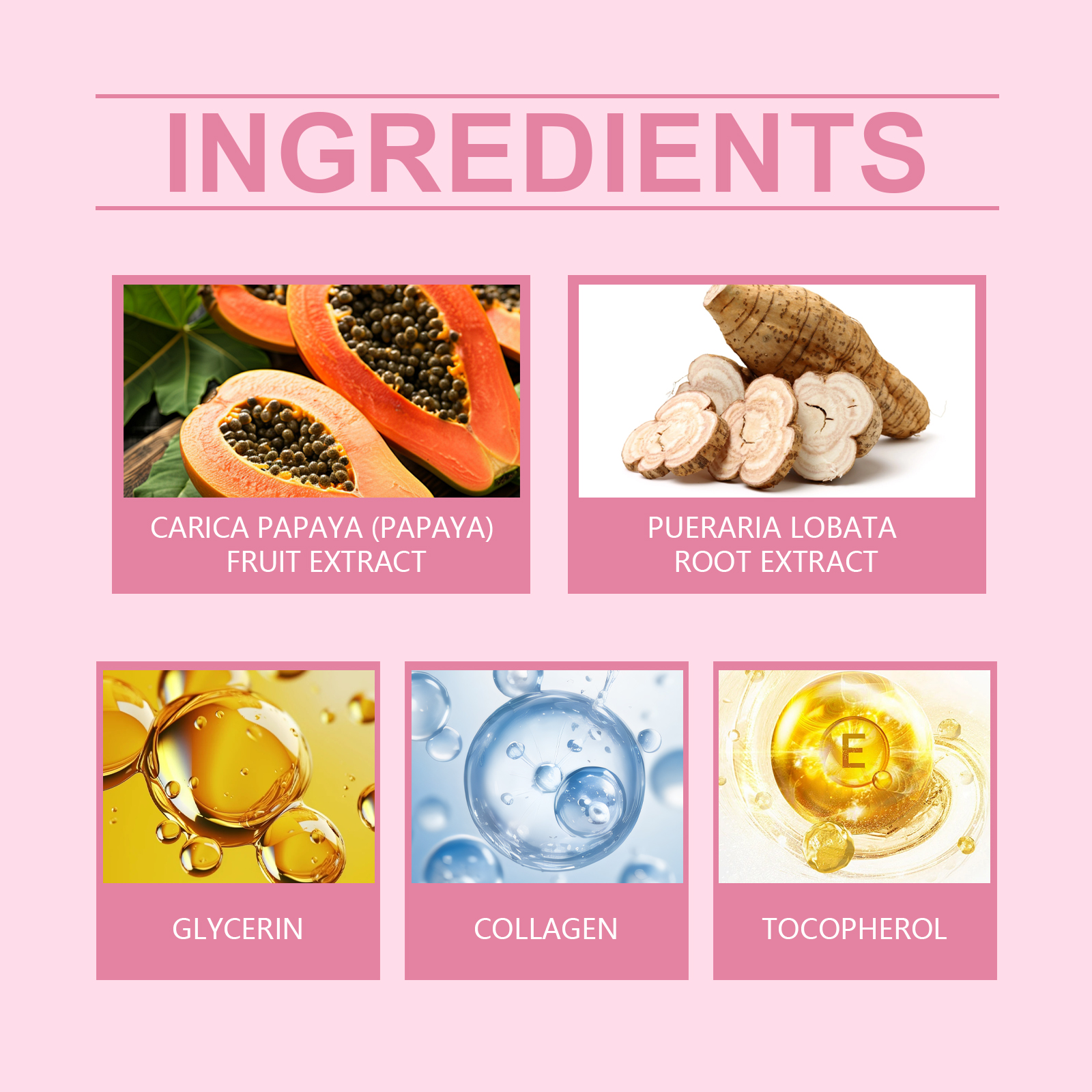 Our Kudzu Papaya Breast cream contains glycerin, papaya extract, Kudzu root extract. It can shape the ideal breasts, enhance dress confidence contains a variety of skin care essence, keep skin healthy. The way to use it is simple: 1. Wash the chest skin and keep it dry. 2. Apply proper amount of face cream to chest skin evenly. 3. Massage gently in circular motions to promote absorption. Deeply nourishes chestnut skin and improves dryness and flabby skin. Light and aromatic, pleasant to use.