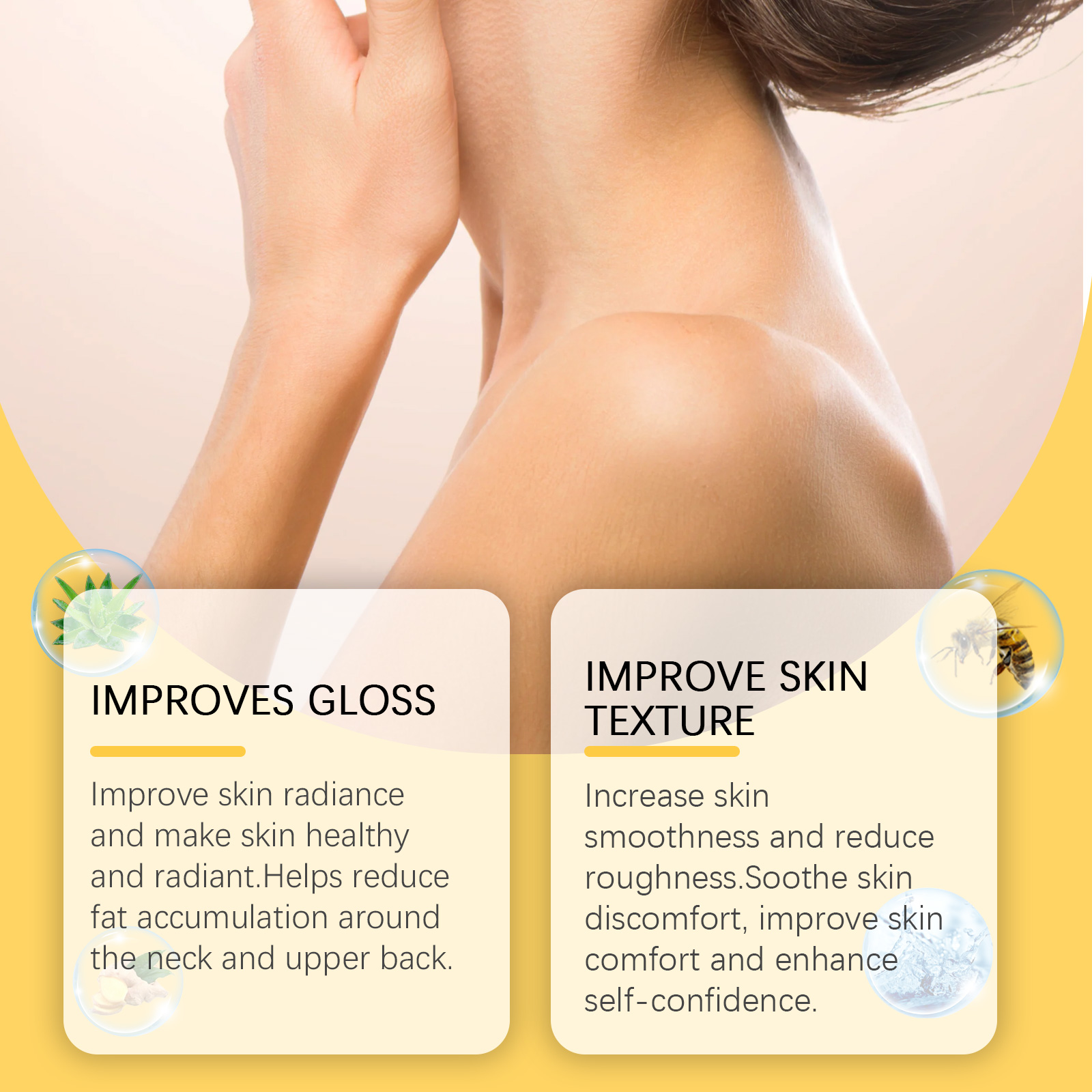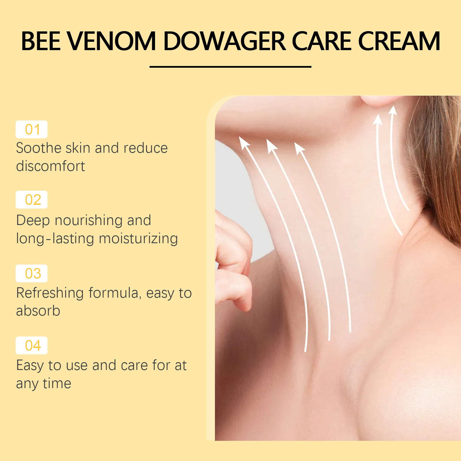 Our Bee Venom Cream contains bee venom, ginger root extract and chamomile flower extract. It can improve skin glow and make skin healthy and radiant. Helps reduce the amount of fat that accumulates in the neck and upper back. Increases skin smoothness and reduces wrinkles. Relieve skin discomfort, improve skin comfort and enhance self-confidence. Its application method is simple: 1. Clean the skin of the neck and upper back and keep it dry; 2. Apply appropriate amount of the product evenly on neck and upper back skin; 3. Gently massage until fully absorbed. Bee Venom and Princess Neck and Back Care Cream makes skin firmer and more elastic, providing all-round care to meet all skin needs. Mild and non-irritating, suitable for sensitive skin.
