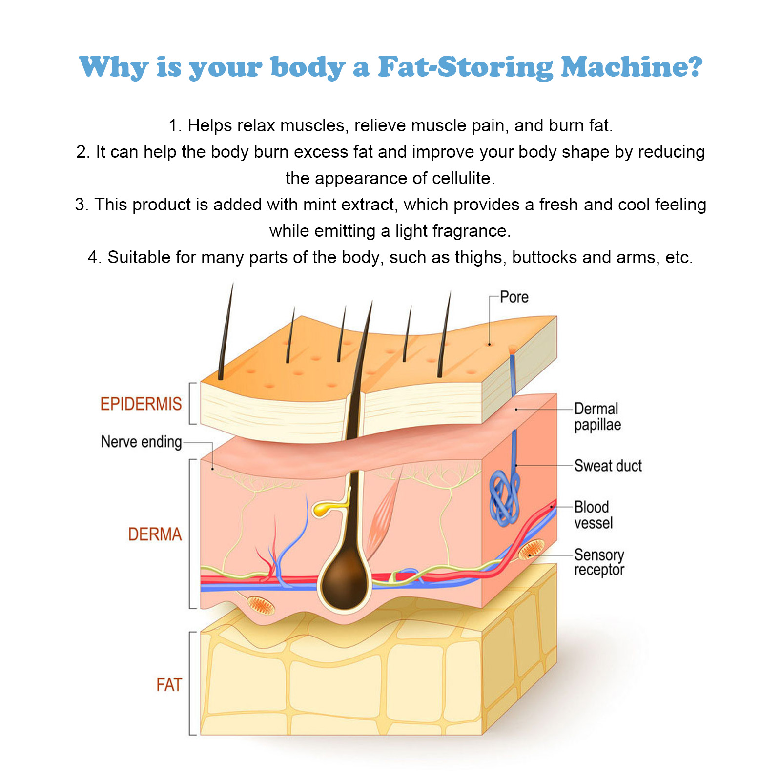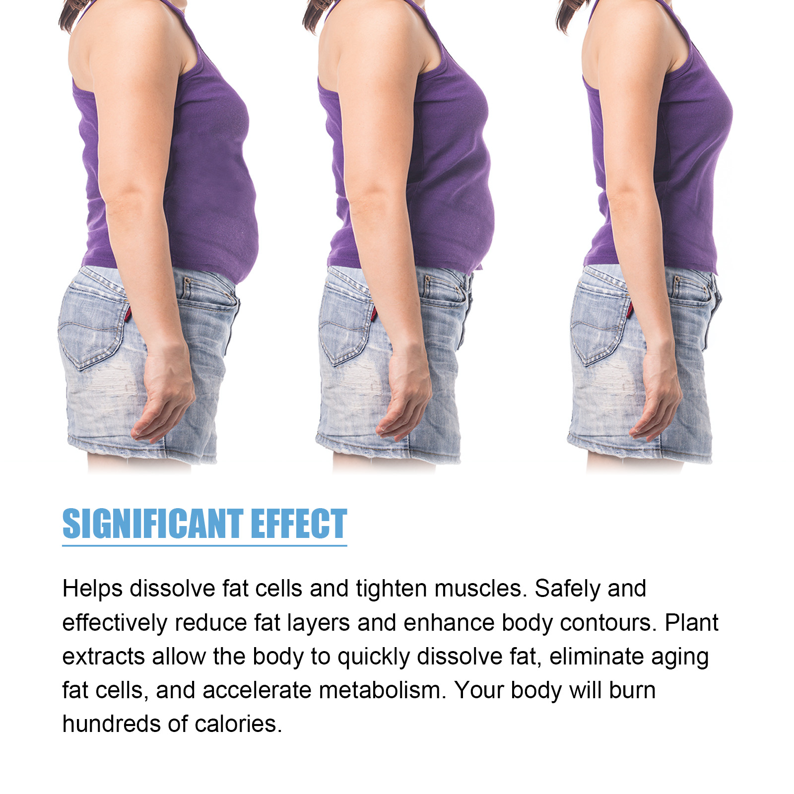 Our Precise Cool Sculpting Gel contains Capsicum Frutescens Fruit Extract, Mentha Piperita(Peppermint Leaf Extract, Foeniculum Vulgare(Fennel) Fruit Extract. It can relax muscles, relieve muscle pain, burn fat, help the body burn excess fat, and improve your body shape by reducing the appearance of cellulite, providing a fresh and cool feeling while emitting a light fragrance. Its use method is very simple: first clean the skin of the body, roll the ball on the abdomen, thighs, hips, arms, etc., massage for about two minutes until the product is absorbed. It can help dissolve fat cells, tighten muscles, safely and effectively reduce fat layers, allow the body to quickly dissolve fat, eliminate aging fat cells, and accelerate metabolism.