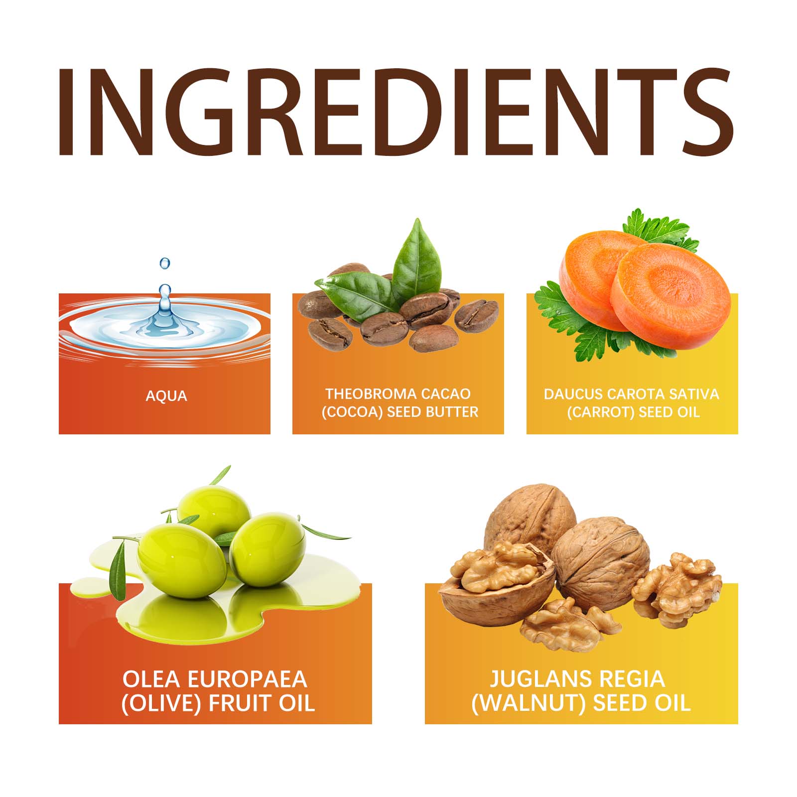 Our Tanning Cream contains Theobroma Cacao(Cocoa) Seed Butter, Daucus Carota Sativa(Carrot) Seed Oil, Olea Europaea(Olive) Fruit Oil. It accelerates tanning and provides a deep, rich, radiant tan while deeply caring your skin for an even tan. Its application method is very simple: wash and dry the skin, evenly apply the product to the desired area, wait 4-6 hours, you can get an even black effect. Can help balance skin tone, hide some uneven or light areas that may appear, create a natural summer tan, moisturize and anti-wrinkle, so that you get an even tan.