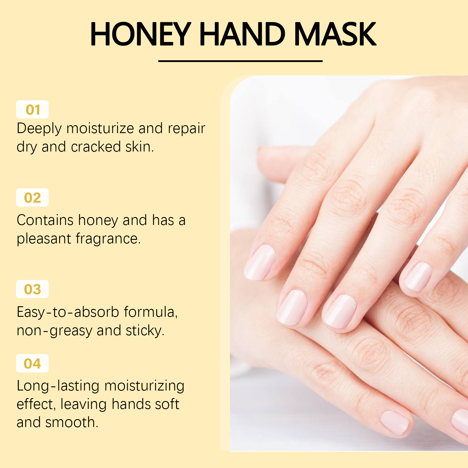 Our honey peel film contains beeswax and sodium hyaluronate. It has a long-lasting moisturizing formula that locks in moisture and keeps the hand skin hydrated all day long, bringing a pleasant use experience and relaxing body and mind. Its application method is very simple: completely clean hand skin, take appropriate amount of this product, evenly apply to the hand skin. Wait 25-30 minutes until the essence has been absorbed before peeling the mask off. And can effectively repair dry, rough skin, improve the health of hand skin.