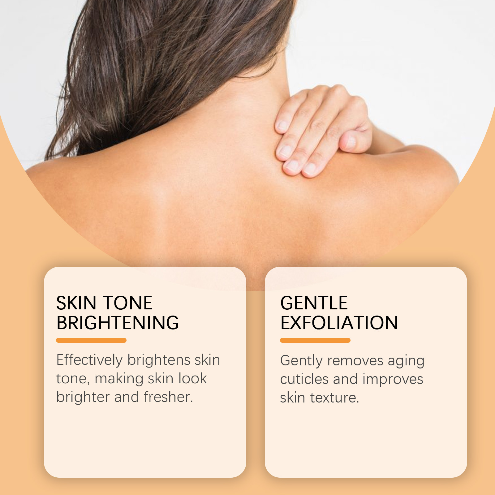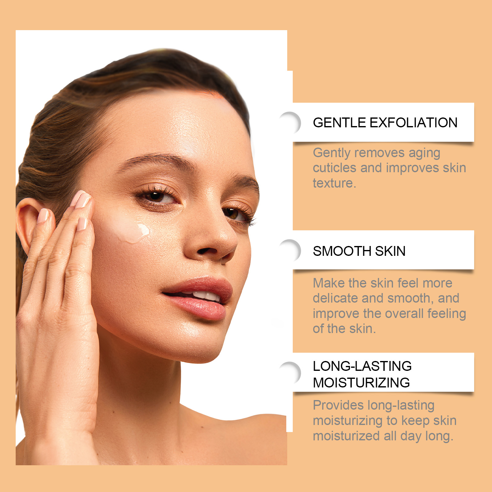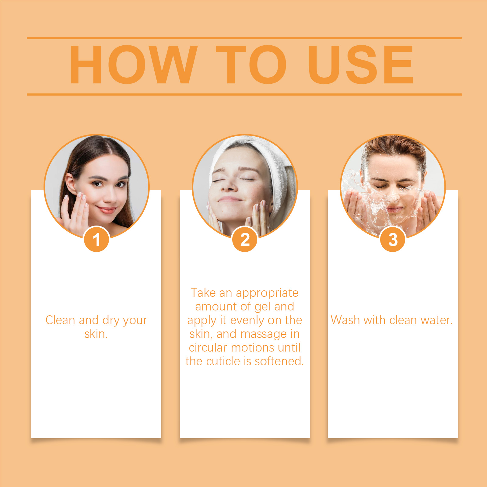 Our exfoliating gel contains citrus extract, niacinamide, vitamin C. It gently removes aged cuticles and improves skin texture. Make skin feel more delicate and smooth, improve the overall feeling of skin. Provides long-lasting moisture that keeps skin moisturized throughout the day. The way to use it is simple: 1. Clean and dry the skin. 2. Apply appropriate amount of gel evenly on the skin, massage in circular motions until the cuticle softens; 3. Wash with water. The exfoliating gel is effective in brightening the complexion, leaving the skin looking brighter and fresher. Gently removes aged cuticles and improves skin texture. Improves skin texture and makes skin smoother.