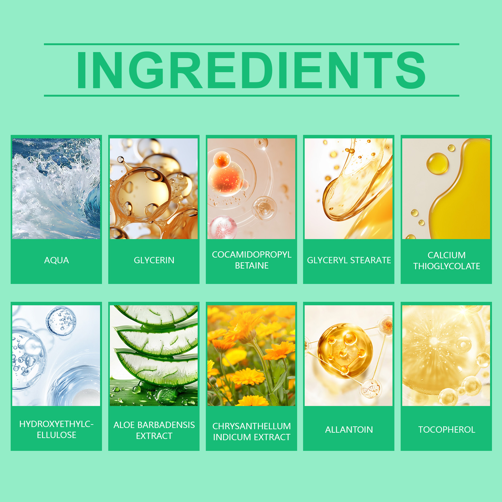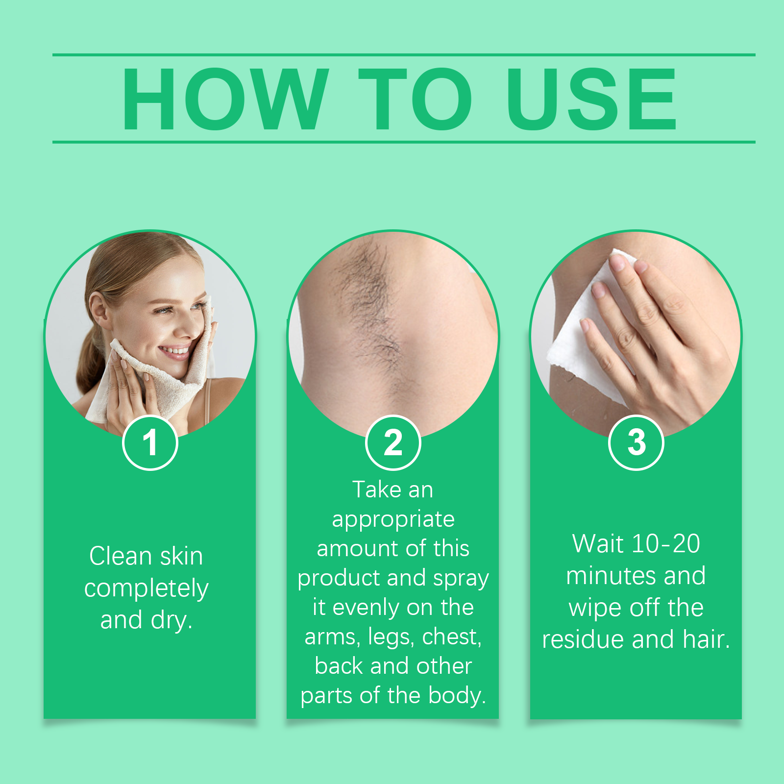 Our gentle hair removal spray contains calcium thioglycolate and glycerin. It can remove hair easily, comfortable without irritation, suitable for sensitive skin. Spray with time saving, convenient and quick solution to hair removal troubles. Its application method is simple: take a proper amount of this product on clean skin, wait 10-20 minutes, and evenly spray this product on arms, legs, chest, residue, hair, back and other parts of the body. And can solve armpits, hand hair, leg hair and other parts, the whole body hair removal without dead corners. Effectively slows regeneration, keeps skin smooth and reduces the need for frequent hair removal.