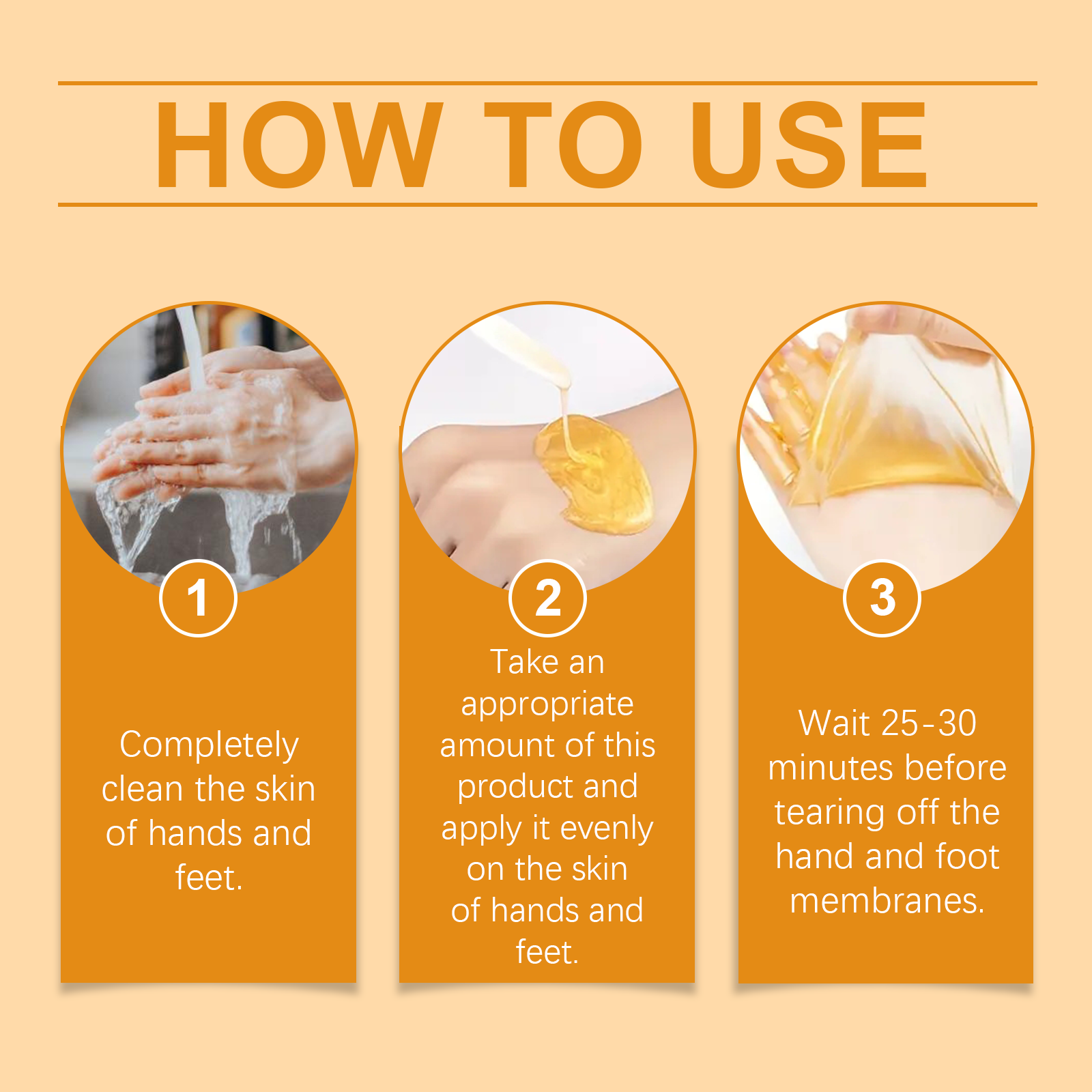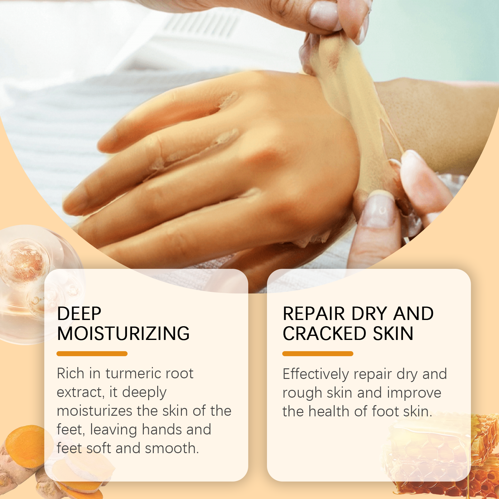Our vitamin C turmeric torn hand and foot mask contains beeswax and sodium hyaluronate. It has a long-lasting moisturizing formula that locks in moisture and keeps foot skin hydrated all day long, bringing a pleasant use experience and relaxing body and mind. Its use method is very simple: take an appropriate amount of this product, evenly spread on the skin of hands and feet. Wait 25-30 minutes and then peel off the foot film. And can effectively repair dry, rough skin and improve the health of foot skin.