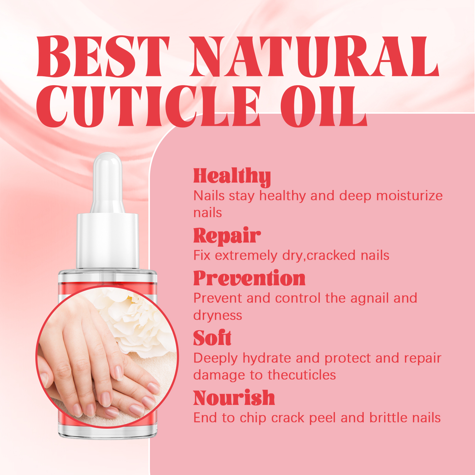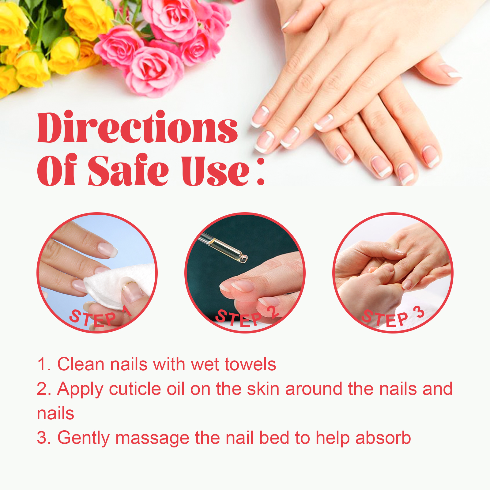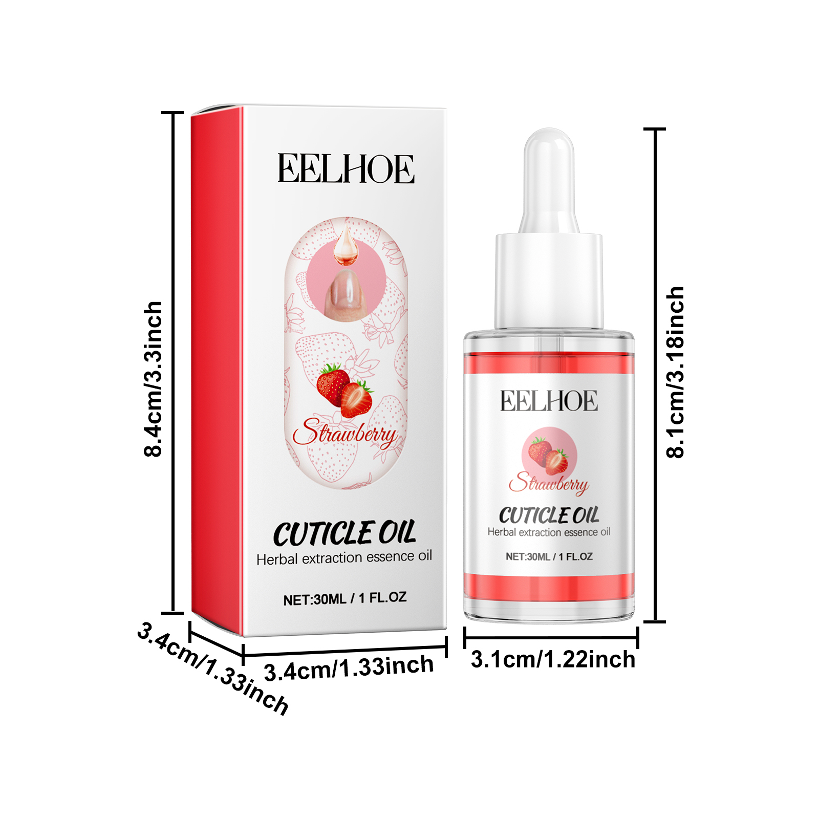 Our Cuticle Oil contains Fragaria Chiloensis (Strawberry)Fruit Extract, Simmondsia Chinensis(Jojoba) Seed Oil, Camellia Sinensis Seed Oil. It moisturizes dry nails and hands to keep them healthy, nourishes fragile nails and dry cuticles, and enhances the appearance of nails, making them more beautiful and shiny. Its application is simple: Clean your nails with a wet towel, apply this product to your nails and the skin around your nails, and gently massage the nail bed to help absorb. It can deeply moisturize nails and surrounding skin and relieve dryness.