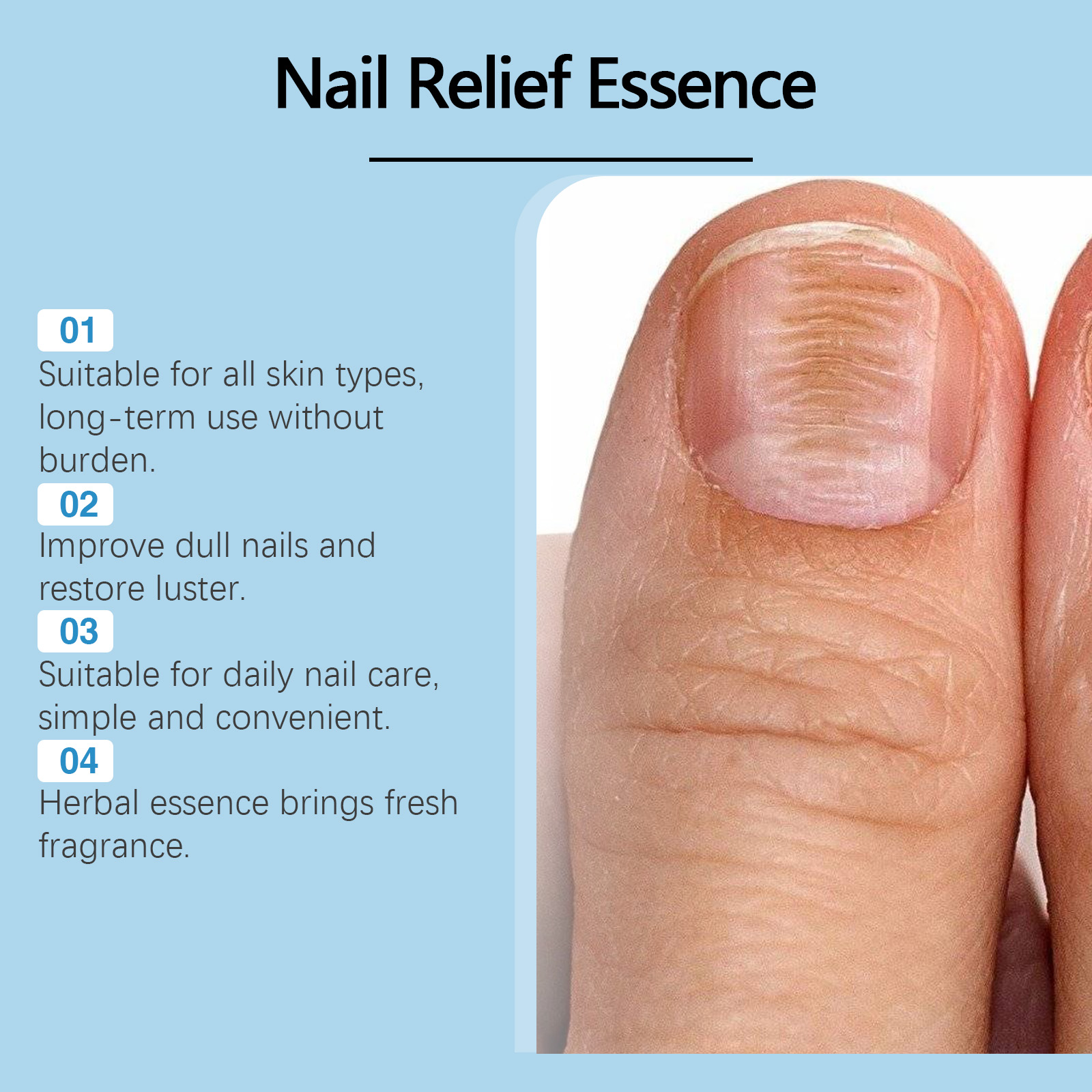 Our nail repair spray contains sweet almond oil, vitamin E. It can gradually fade nail discoloration and reduce the formation of gray nails. Its use is simple: keep the nails and surrounding skin dry, apply the product evenly to the nails and surrounding skin, and wait for absorption. And it can effectively kill bacteria, inhibit fungal growth, and quickly alleviate the problem of gray nails.