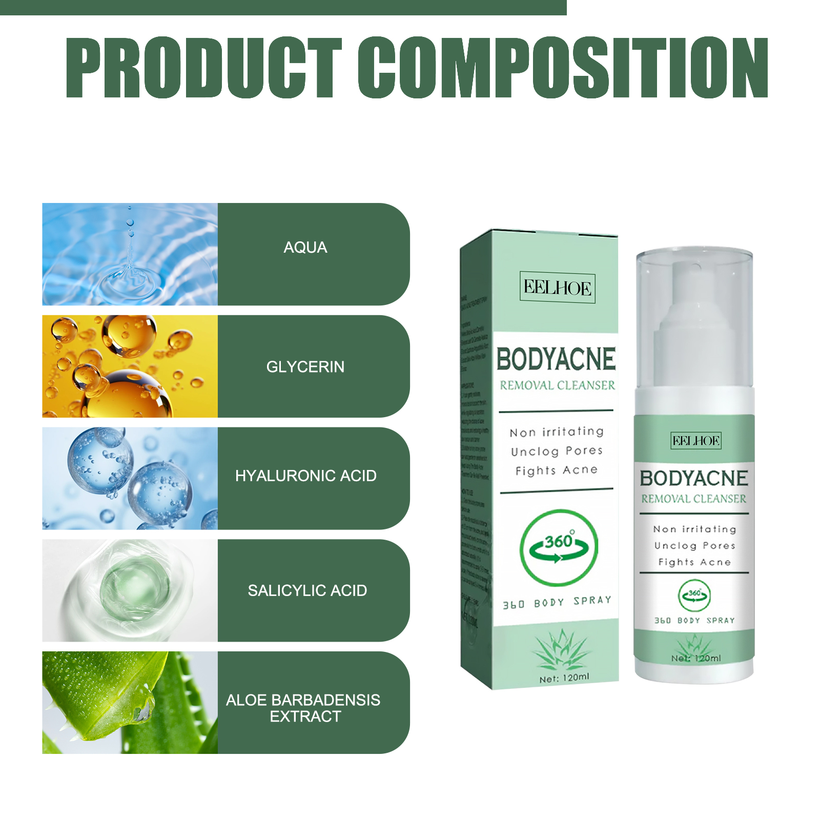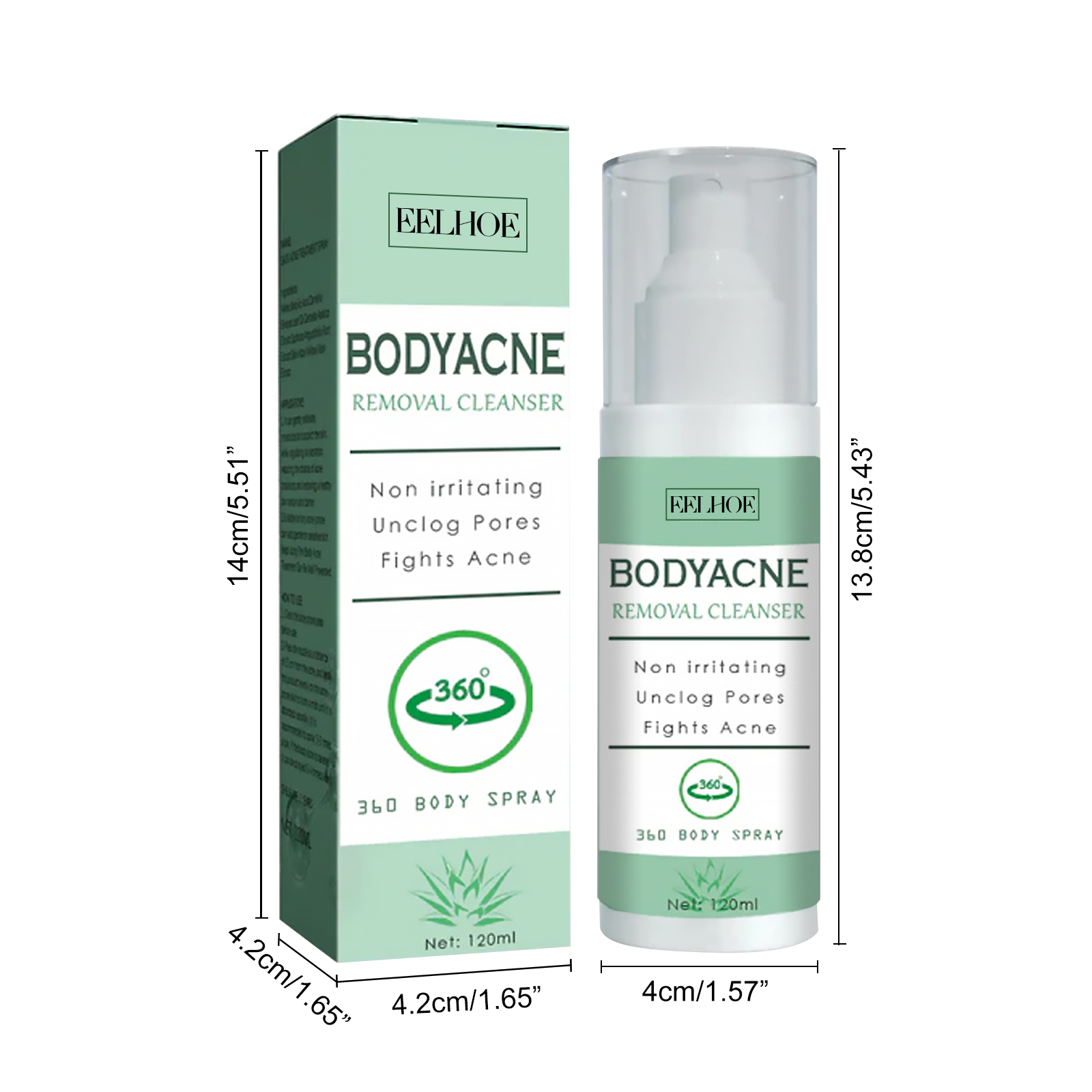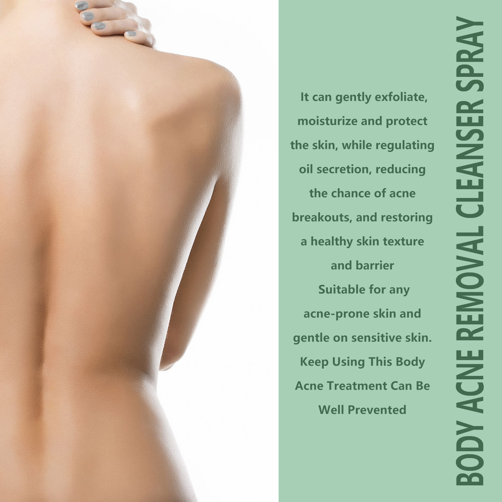 Our body care spray contains glycerin and hyaluronic acid. It can gently exfoliate, moisturize and protect the skin, while regulating sebum secretion, reducing the chance of acne breakdowns, and restoring healthy skin texture and barrier. Its usage method is very simple: Before use, clean the areas prone to acne. Press the nozzle 15 centimeters away from the acne area, and evenly apply this product to the skin prone to acne, forming a mist until it is naturally absorbed. It is recommended to spray 2 to 3 times a day. If you have severe acne, you can spray 3 to 4 times a day. It can effectively regulate the body's water and oil balance, reduce acne and pimples, and repair the skin barrier.