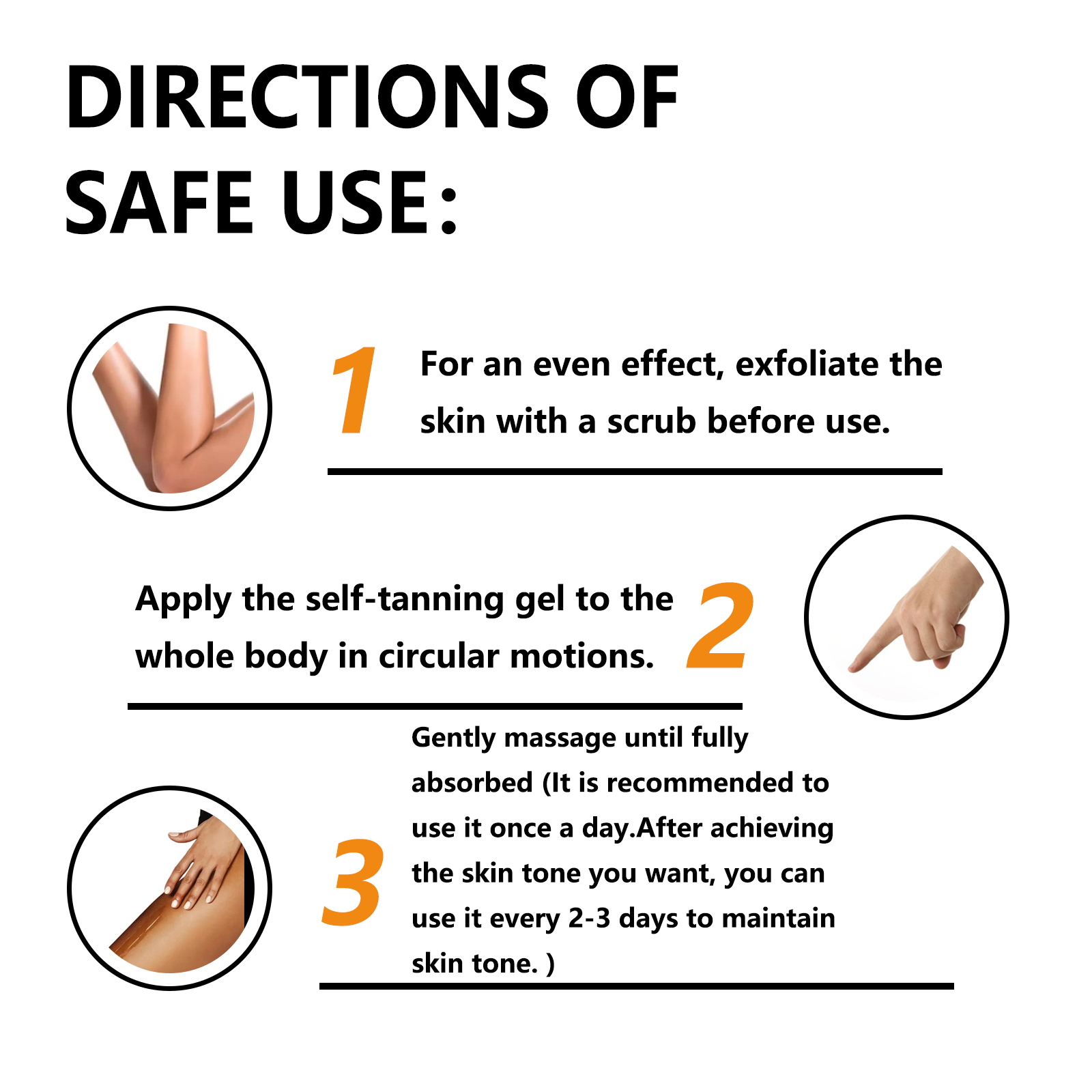 Our Intensive Tanning Gel contains Tocopherol, Calendula Officinalis Flower Extract, Daucus Carota Sativa (Carrot) Seed Oil. It gives an even dark effect and keeps your skin tanned, with a long-lasting tan, and provides a long-lasting moisturizing effect that leaves the skin soft and smooth. Its application is simple: To achieve an even effect, exfoliate with a scrub before use, apply the product to the whole body in a circular motion, and gently massage until fully absorbed (recommended once a day). After reaching your desired skin tone, you can use it every 2-3 days to maintain your skin tone.) Creates a natural summer tan that moisturizes and resists wrinkles, giving you an even tan.