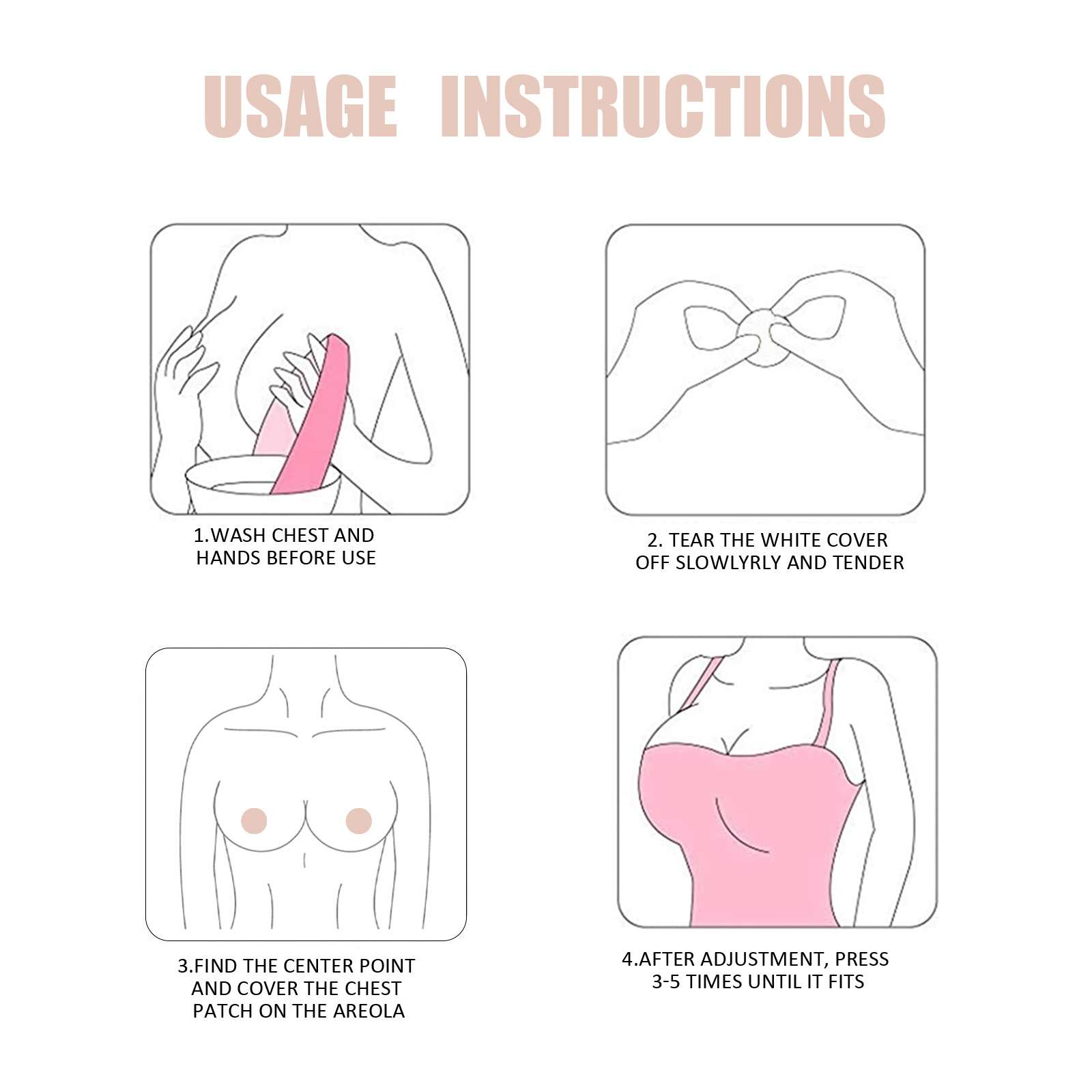 Our invisible nipple strips contain PE material. It helps prevent friction, exposure, and bumps. Its use method is very simple: 1. Wash your hands before use. 2. Slowly and gently peel off the white lid. 3. Find the center point and cover the breast on the areola. 4. After adjustment. Press 3-5 times until it fits. After use, you can feel that this is a more intangible and natural product for the chest. Whether it's a bikini, a running party, or a sports date, it's easy to handle.