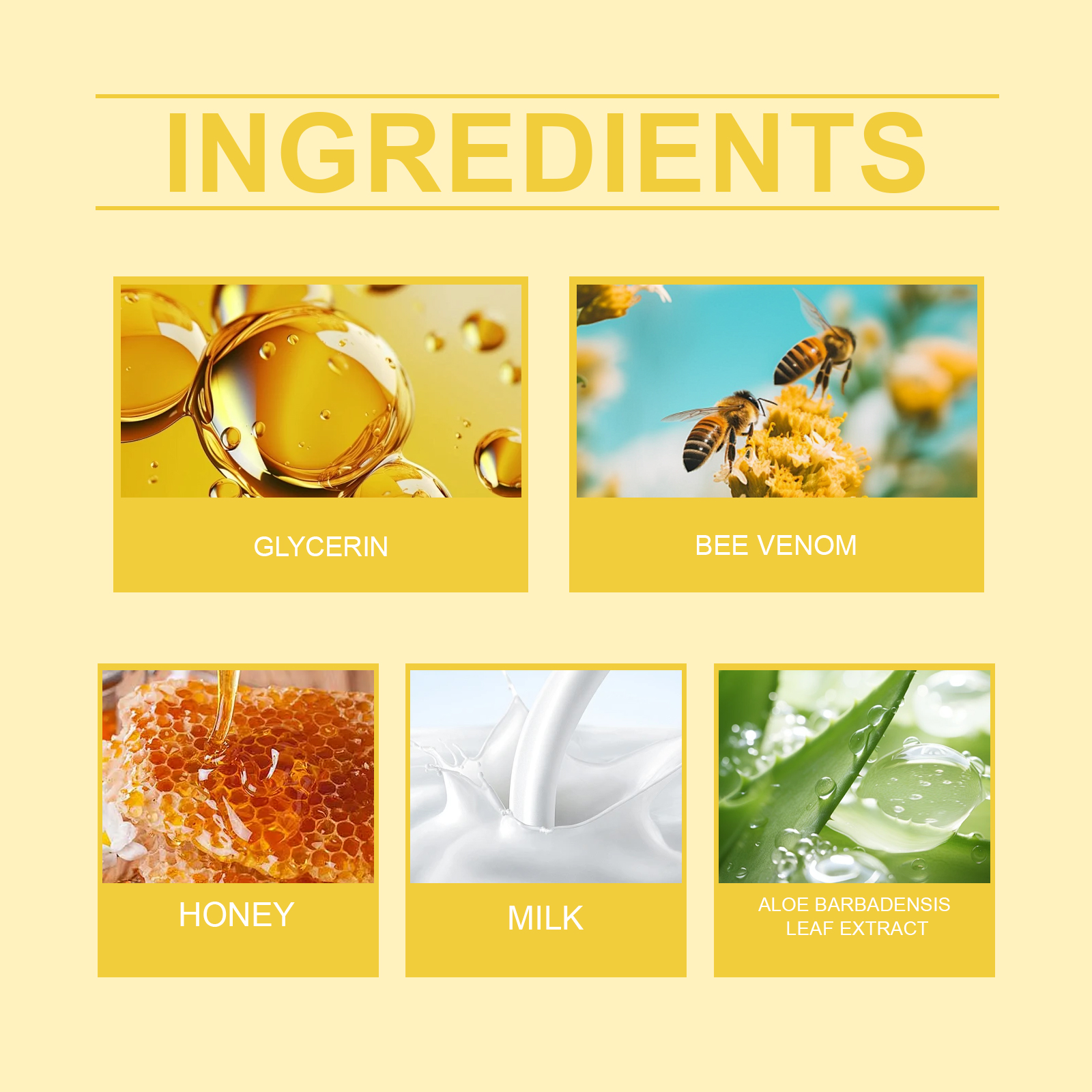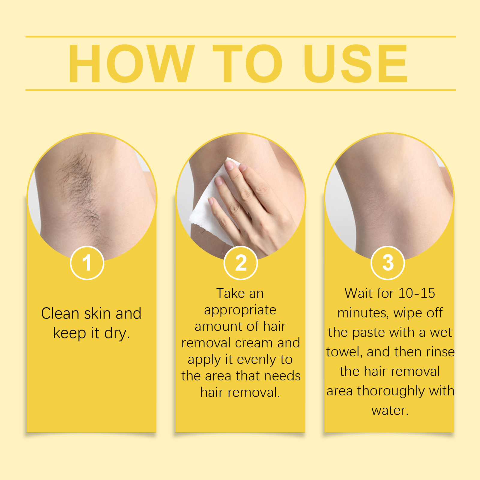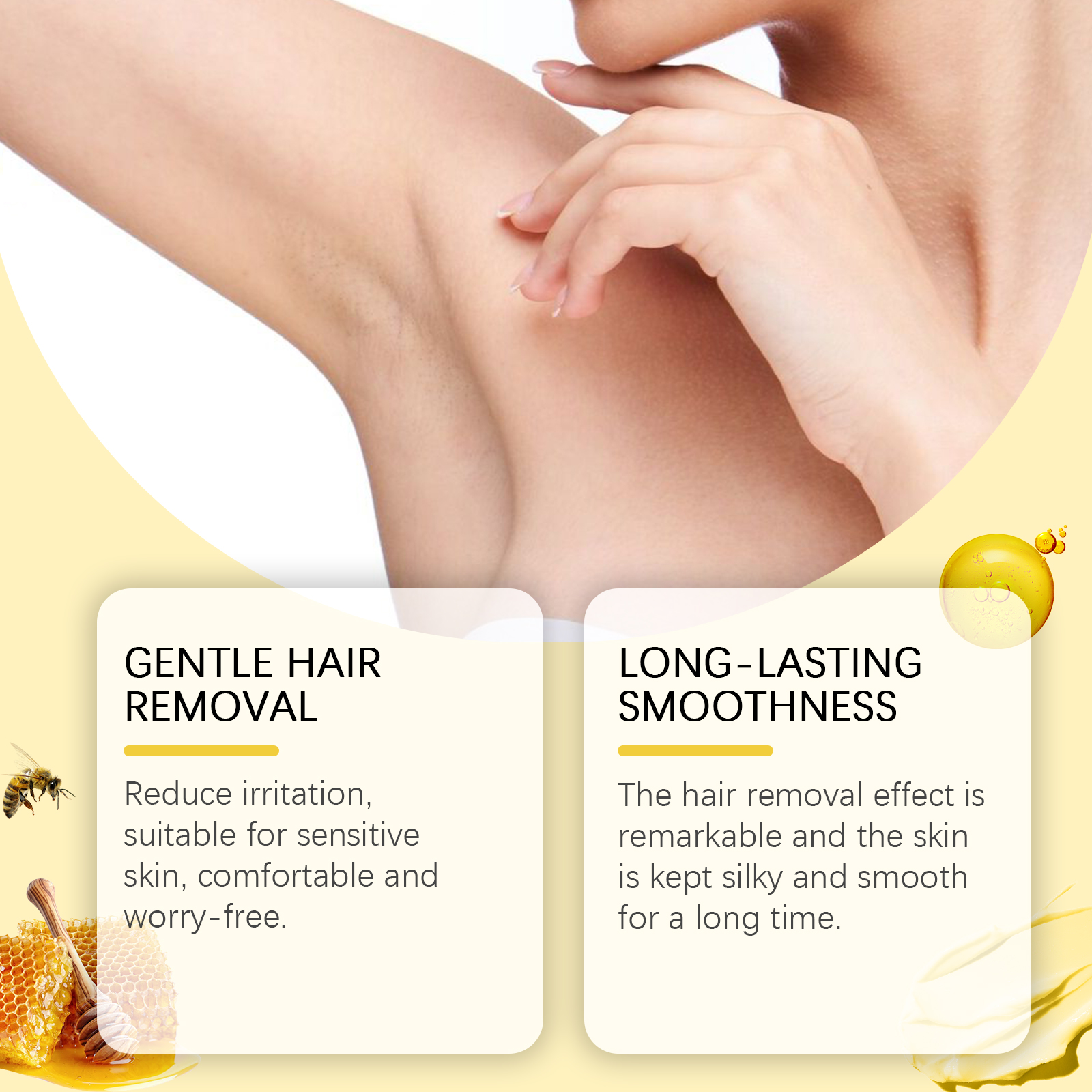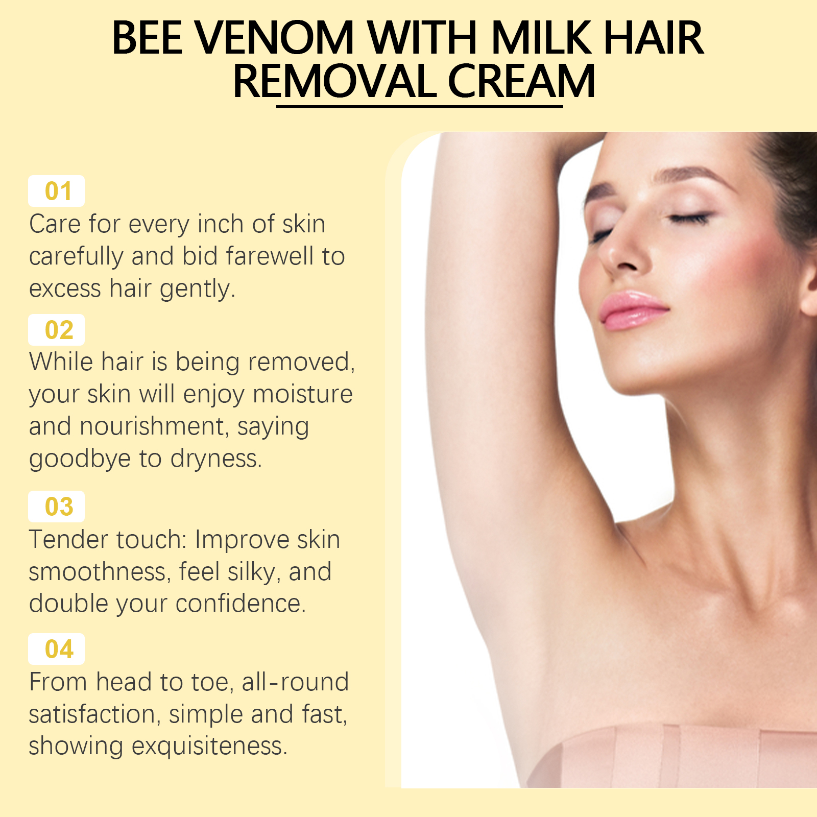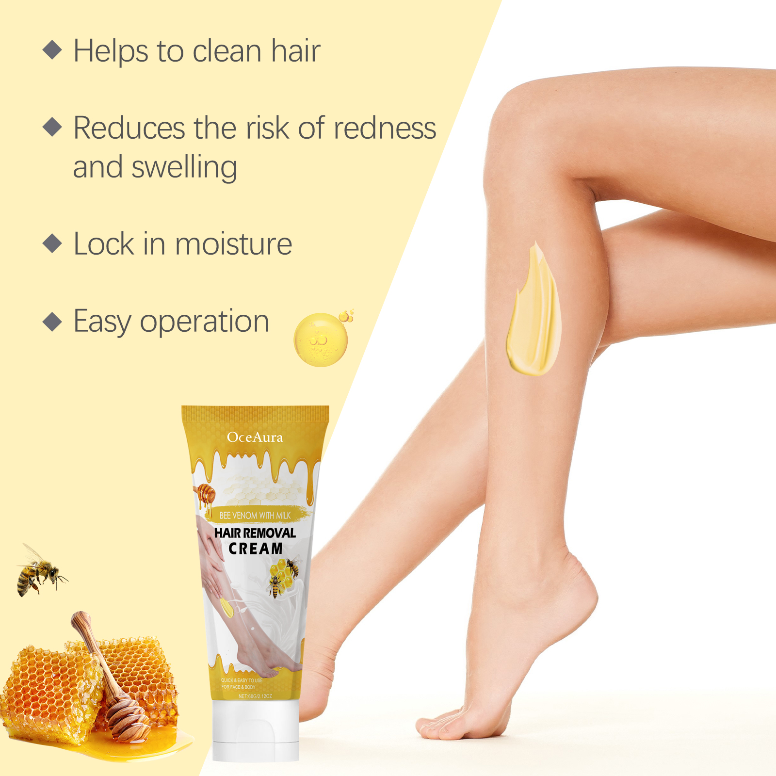 Our bee-venom milk moisturizing hair removal cream contains glycerin, bee venom, honey. It can reduce irritation. Suitable for sensitive skin, comfortable and carefree. The hair removal effect is remarkable, and the skin stays silky and smooth for a long time. The way to use it is simple: 1. Clean your skin and keep it dry. 2. Take proper amount of hair removal cream and evenly apply it to the parts that need hair removal. 3. Wait 10-15 minutes, wipe off the paste with a damp towel, then rinse the hair removal area thoroughly with water. Bee Venom Milk Moisturizing Depilatory Cream promotes skin renewal and natural glow. Helps clean hair, is not afraid to wear short clothes, and shows confident skin.