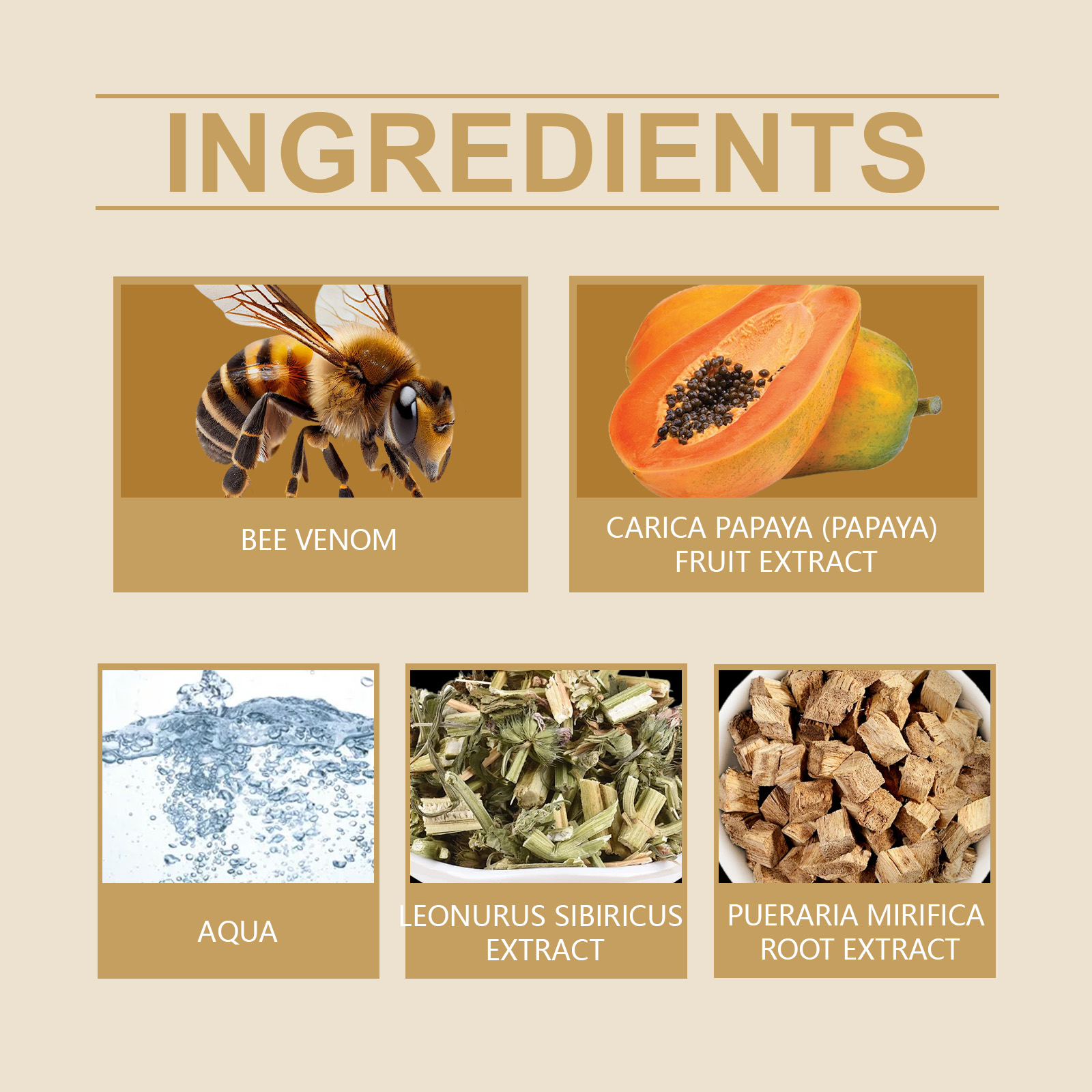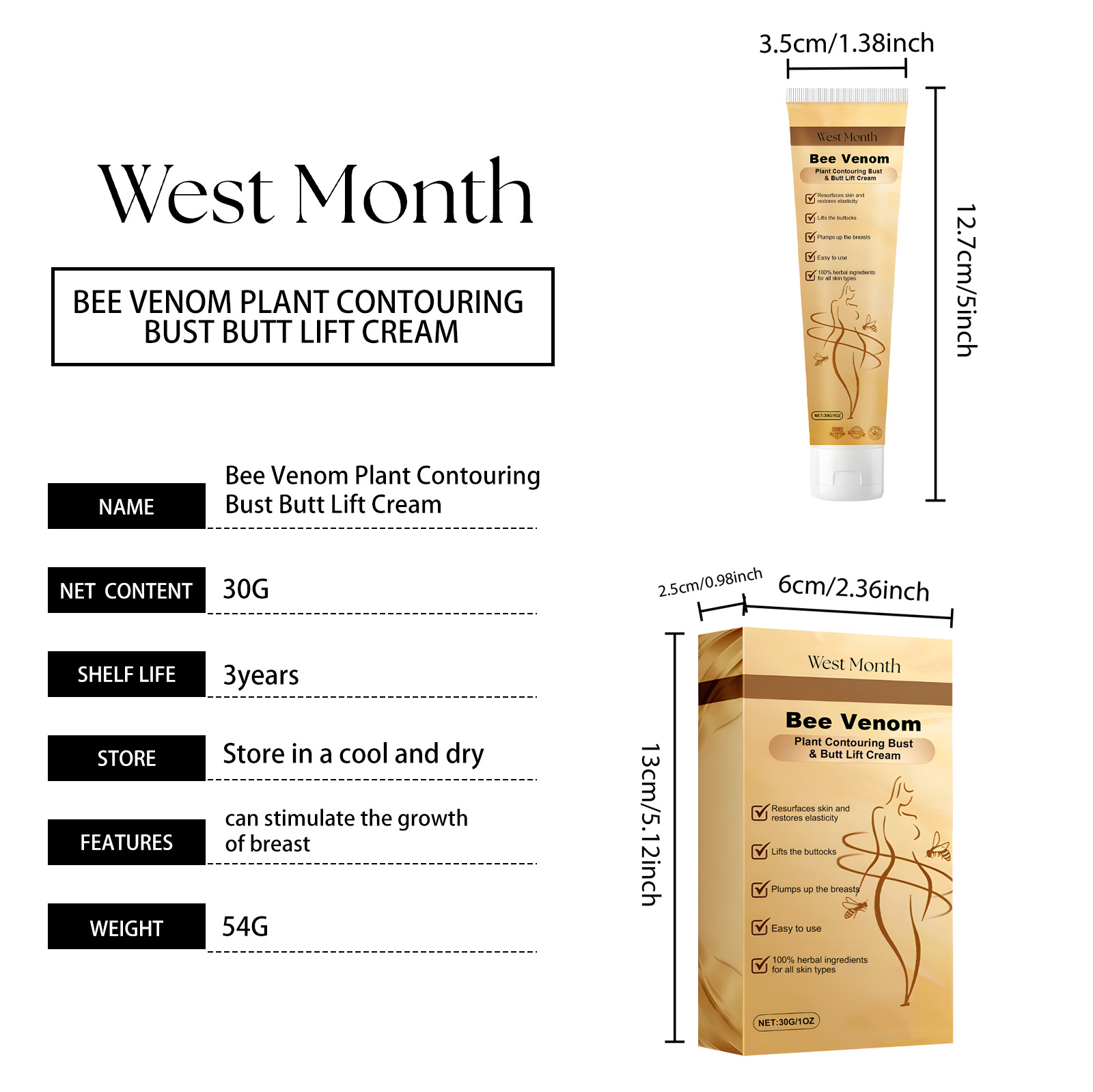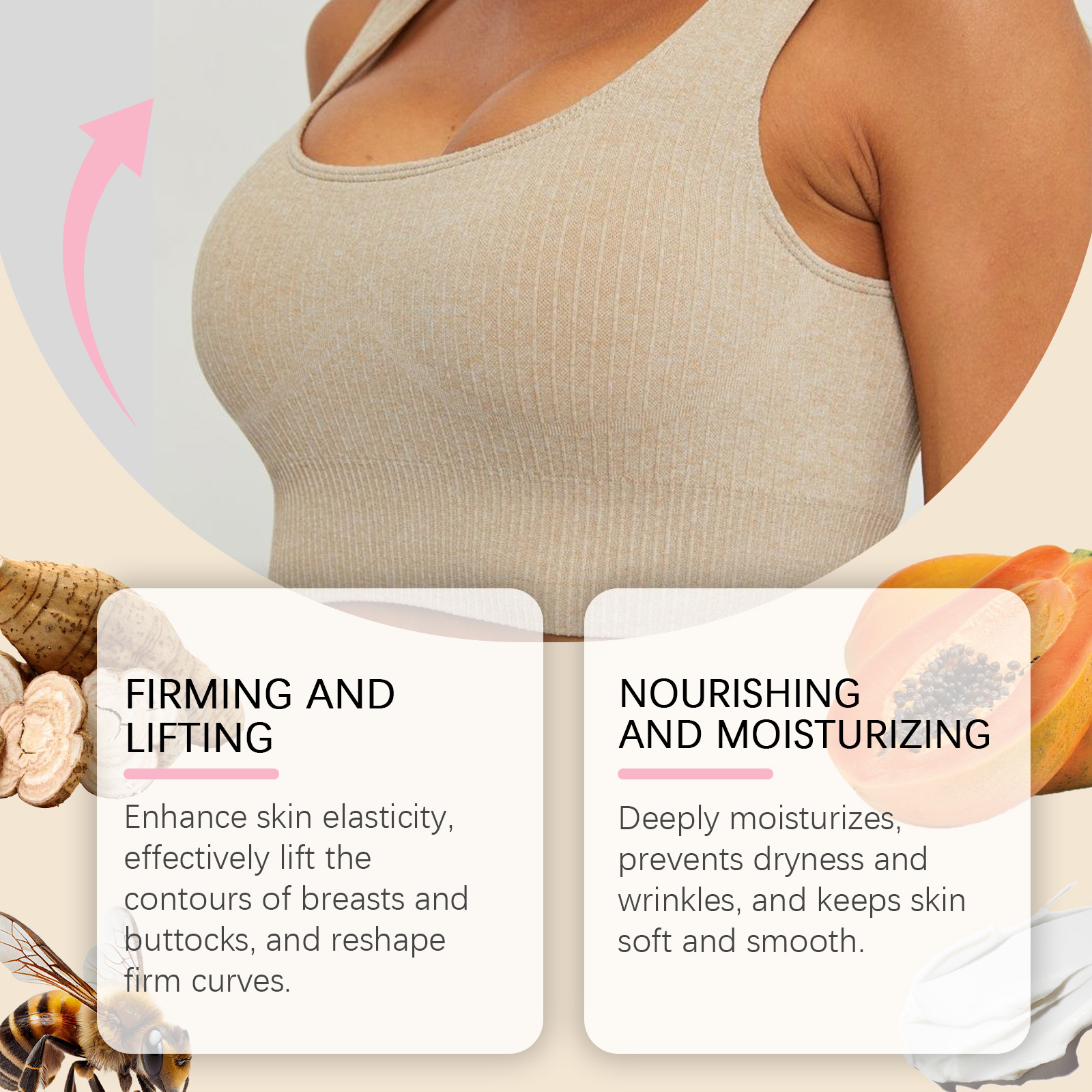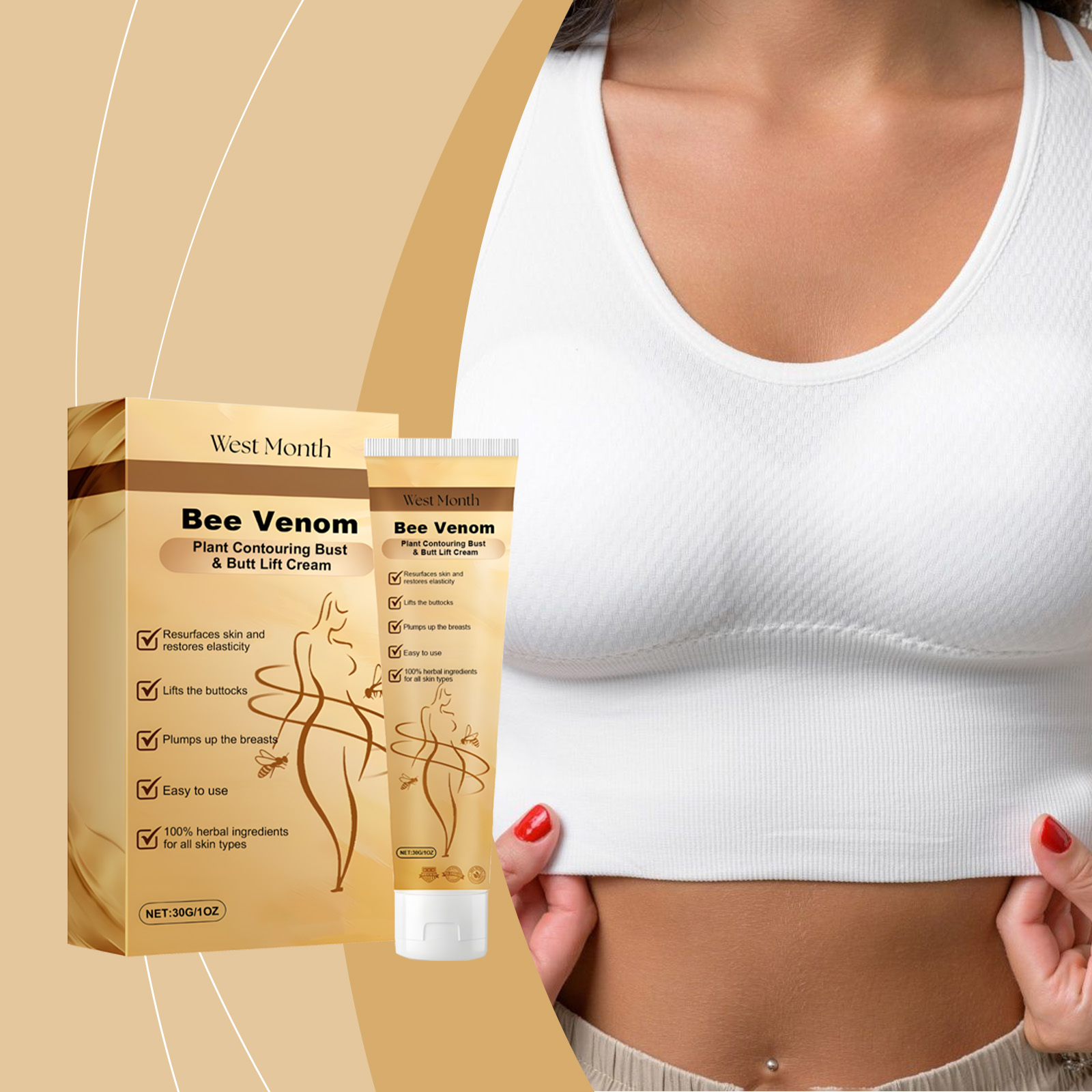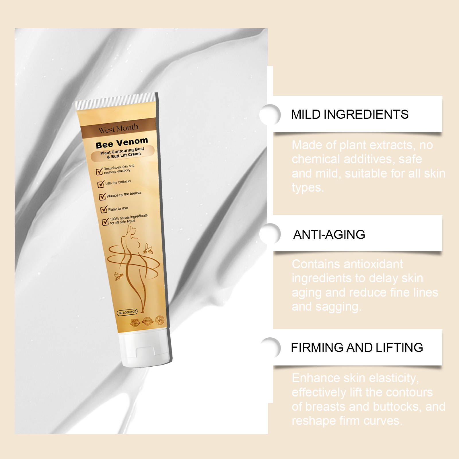 Our breast cream contains bee venom, papaya extract and motherwort extract. It can enhance the elasticity of the skin, effectively enhance the contour of the breasts and hips, and reshape the curves. Its application method is very simple: 1. Thoroughly clean the skin, dry it first; 2. Apply appropriate amount of this product evenly to the breast, buttocks and other skin parts that need to be shaped. 3. Gently massage until completely absorbed. Moisturize deeply, prevent dryness and wrinkles, and keep skin soft and smooth.