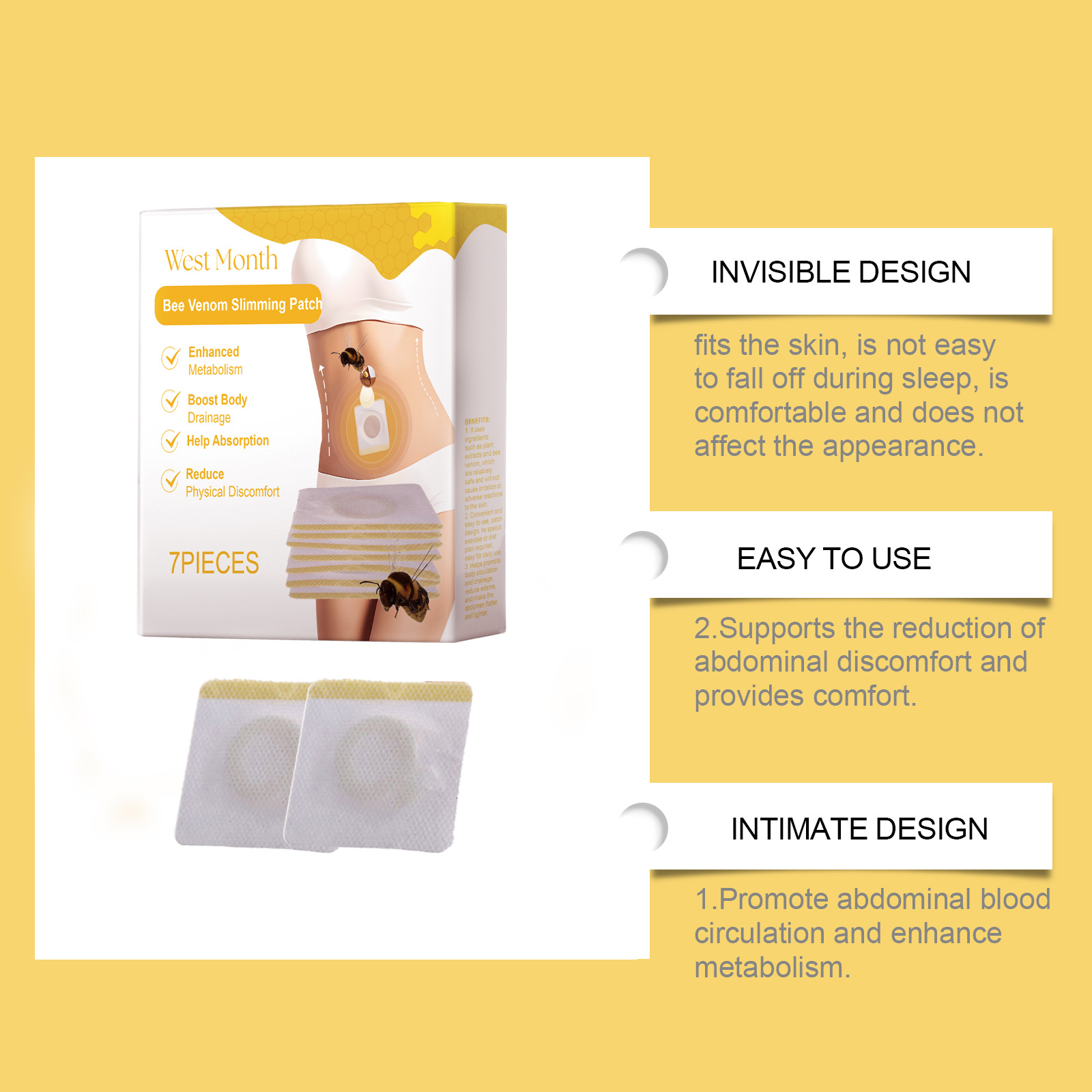 Our bee Venom slimming patch contains bee venom, wormwood and black pepper extract. It can promote body circulation and drainage, reduce edema, make the abdomen flat and firm; Support reduces abdominal discomfort and provides comfort; Promote abdominal blood circulation and increase metabolism. Fit the skin, not easy to fall off when sleeping, uncomfortable, does not affect the appearance. Its use method is very simple: 1. Wash the abdomen and keep dry; 2. Point the patch at the abdomen and press gently to ensure good adhesion; 3. Wait 3-4 hours, then remove. Bee Venom Slimming patch is designed to improve abdominal blood circulation and boost metabolism. Provides continuous comfort and reduces abdominal tightness. Highly absorbent formula, non-greasy skin after use.