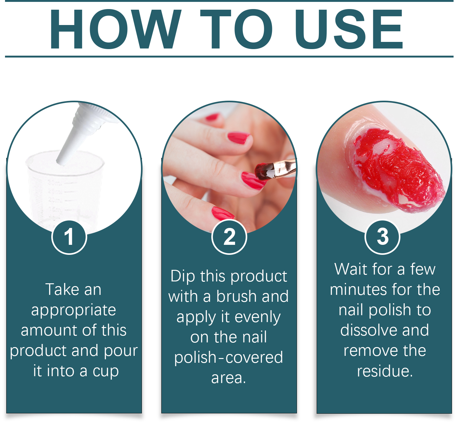Our nail remover contains vitamin E and isopropyl alcohol. It can quickly dissolve nail polish and is easy to operate. Its usage method is very simple: Take an appropriate amount of this product and pour it into a cup. Use a brush to dip this product and evenly apply it to the areas with nail polish. Wait for a few minutes to let the nail polish dissolve and remove the residue. And with a gentle formula, it does not damage the surface of the nails and protects and maintains them.