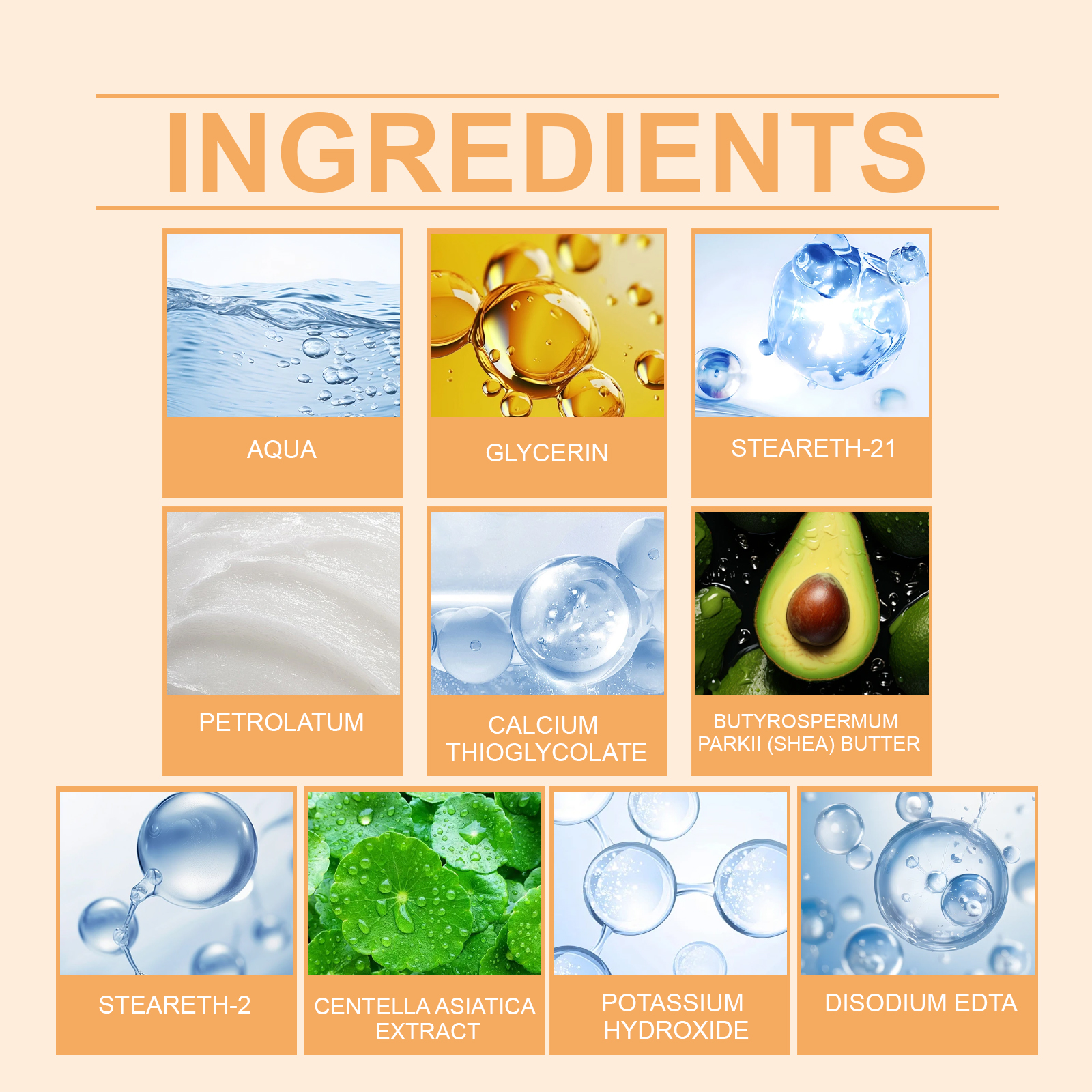 Our body and facial hair removal creams contain deionized water and glycerin. It softens hair quickly, easily removes excess hair, and keeps skin smooth. Moisturize dry skin, reduce itchiness, and enhance post-use comfort. The way to use it is simple: clean the skin and keep it dry. Apply an appropriate amount of this product evenly to the beard around the lips or other skin on the body that needs to be waxed and leave it on for 5-10 minutes. Rinse well with water. And it can effectively delay hair growth and keep the smooth effect longer.