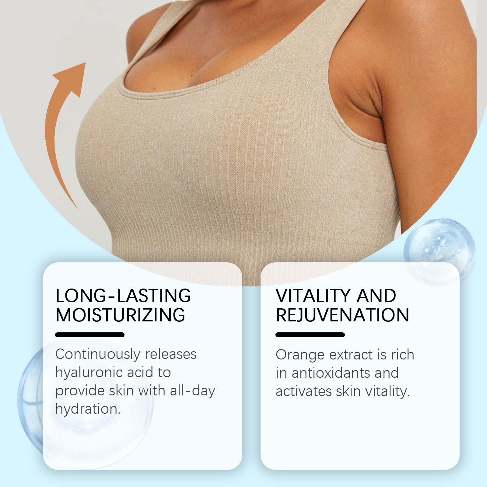 Our Body Butter Anti-wrinkle firming cream contains orange extract and retinol. It can nourish and moisturize, lasting hydration, farewell to dry. Its use method is very simple: clean dry skin, take appropriate amount of product evenly apply to the neck, legs, arms and other body skin. Massage gently until absorbed. And mild formulation, suitable for daily use, safe to use.