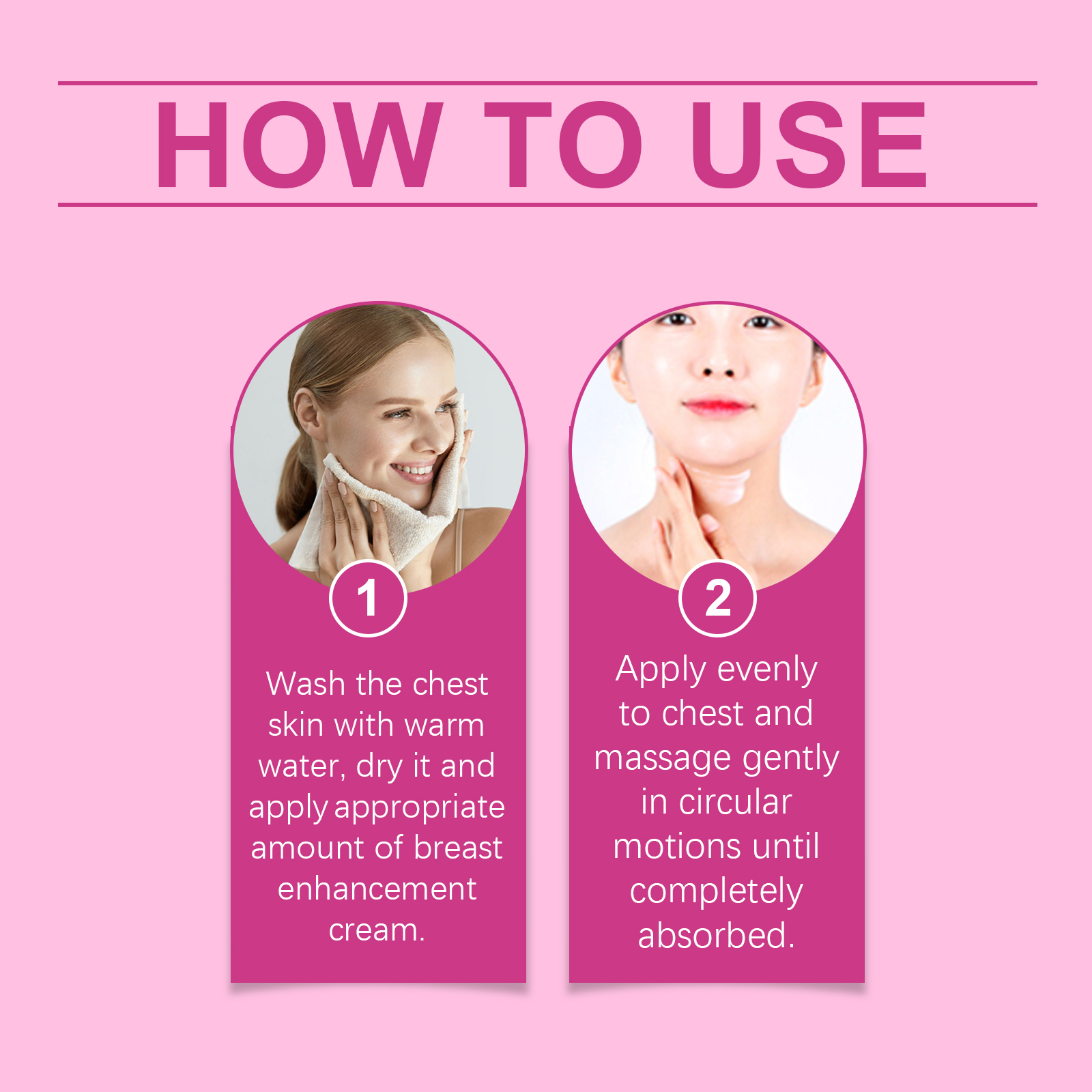 Our breast firming cream contains hyaluronic acid and honey extract. It can improve skin elasticity, prevent sagging skin, and create a perfect figure. The way to use it is very simple: wash the chest skin with warm water, dry it and apply the right amount of breast enhancement cream. Apply evenly to chest and massage gently in circular motion until fully absorbed. And can effectively improve the skin slack and rough, help you to rebuild the firm elastic skin, show attractive curves.