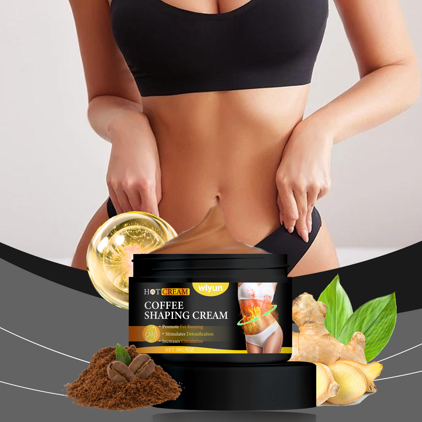 Our body massage cream is carefully formulated with Arabica coffee seed extract, ginger root extract and aloe vera leaf extract from Curacao. Specifically designed to invigorate the skin and shape its curves. Designed to promote blood circulation and firm the skin. The usage method is extremely convenient: 1. Clean the skin of the body and keep it dry; 2. Take an appropriate amount of this product and apply it evenly to the areas that need fat loss. 3. Gently massage until fully absorbed. And it is rich in moisture, making the skin soft and smooth.