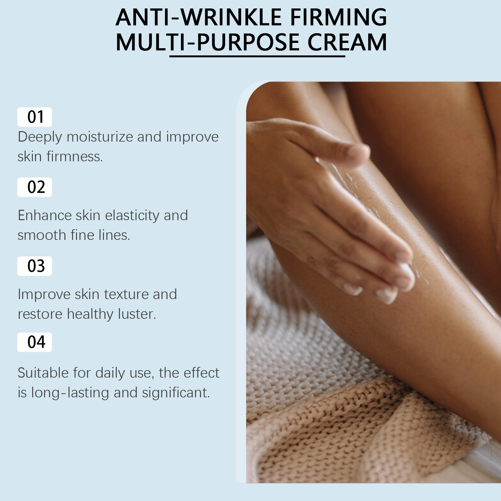 Our skin firming cream contains panthenol, coffee extract. It improves skin texture and restores a healthy glow. Its use method is very simple: clean the skin, keep the skin dry, take appropriate amount of cream, evenly spread on the neck, legs, abdomen, arms and other parts, gently massage to promote absorption. It also soothes the skin and helps keep it smooth