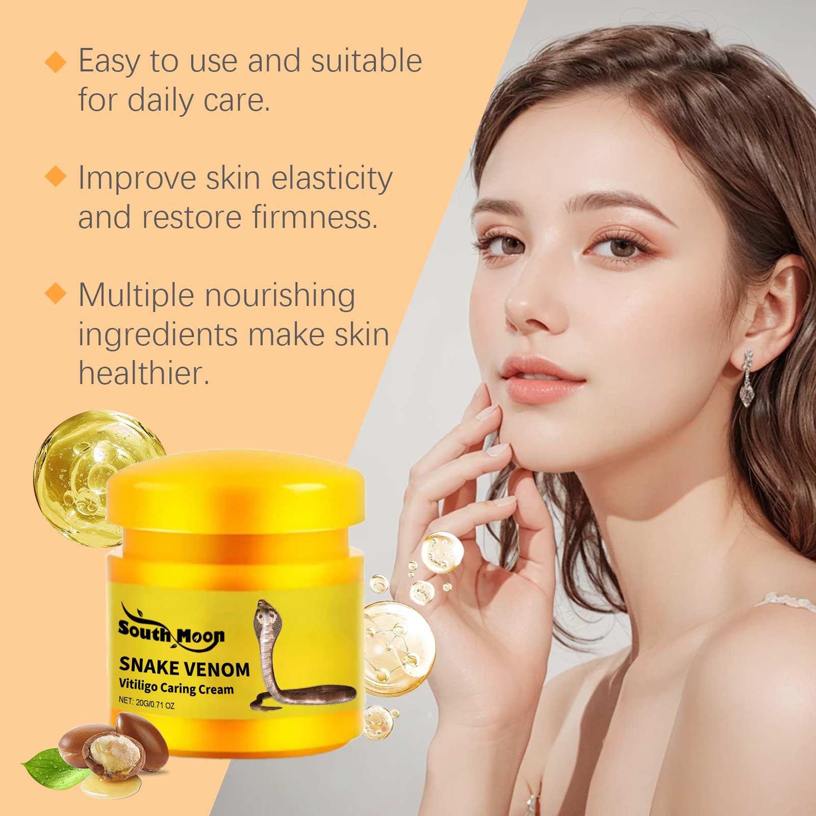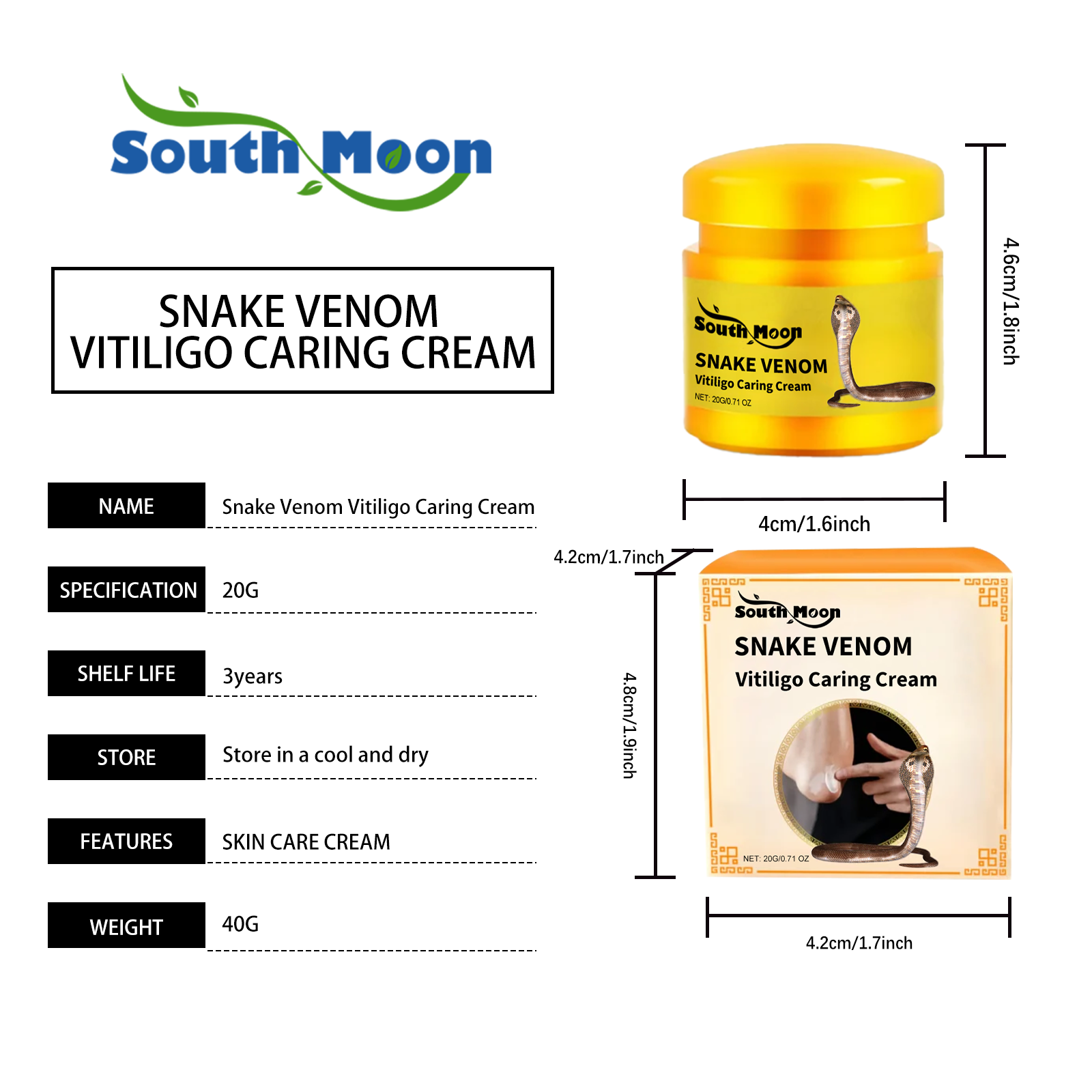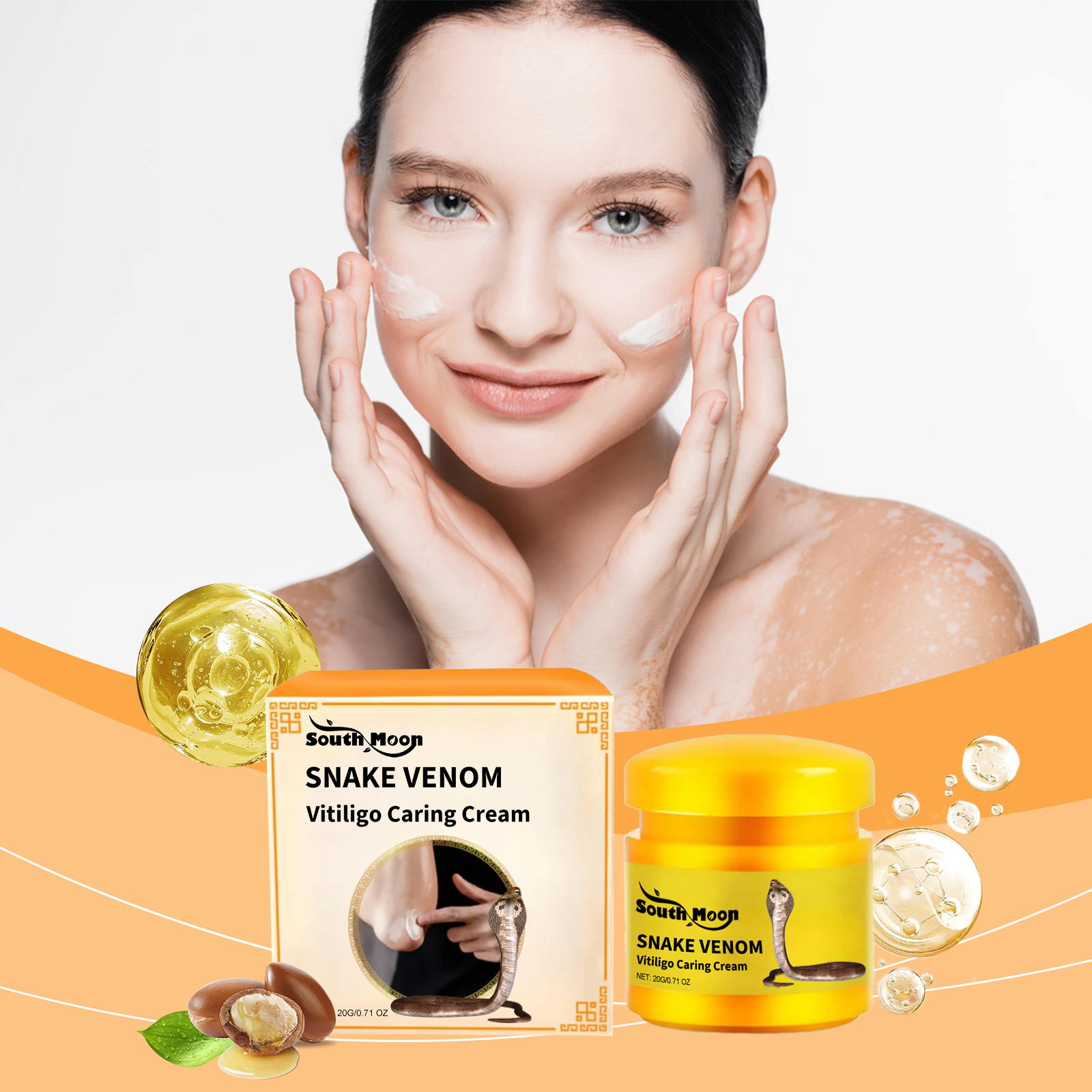 Our skin care cream contains arginine/lysine polypeptides, glycerin, shea butter. It can lighten and even skin tone; Deep moisturizing, lock moisture, moisturize skin; Repair and nourish. Strengthen the skin barrier. Its use method is very simple: take a proper amount of skin cream evenly apply to the parts with white spots or need care, gently massage until completely absorbed. Skin care cream with snake venom essence to lighten skin tone. Shea butter deeply nourishes and repairs damaged skin.