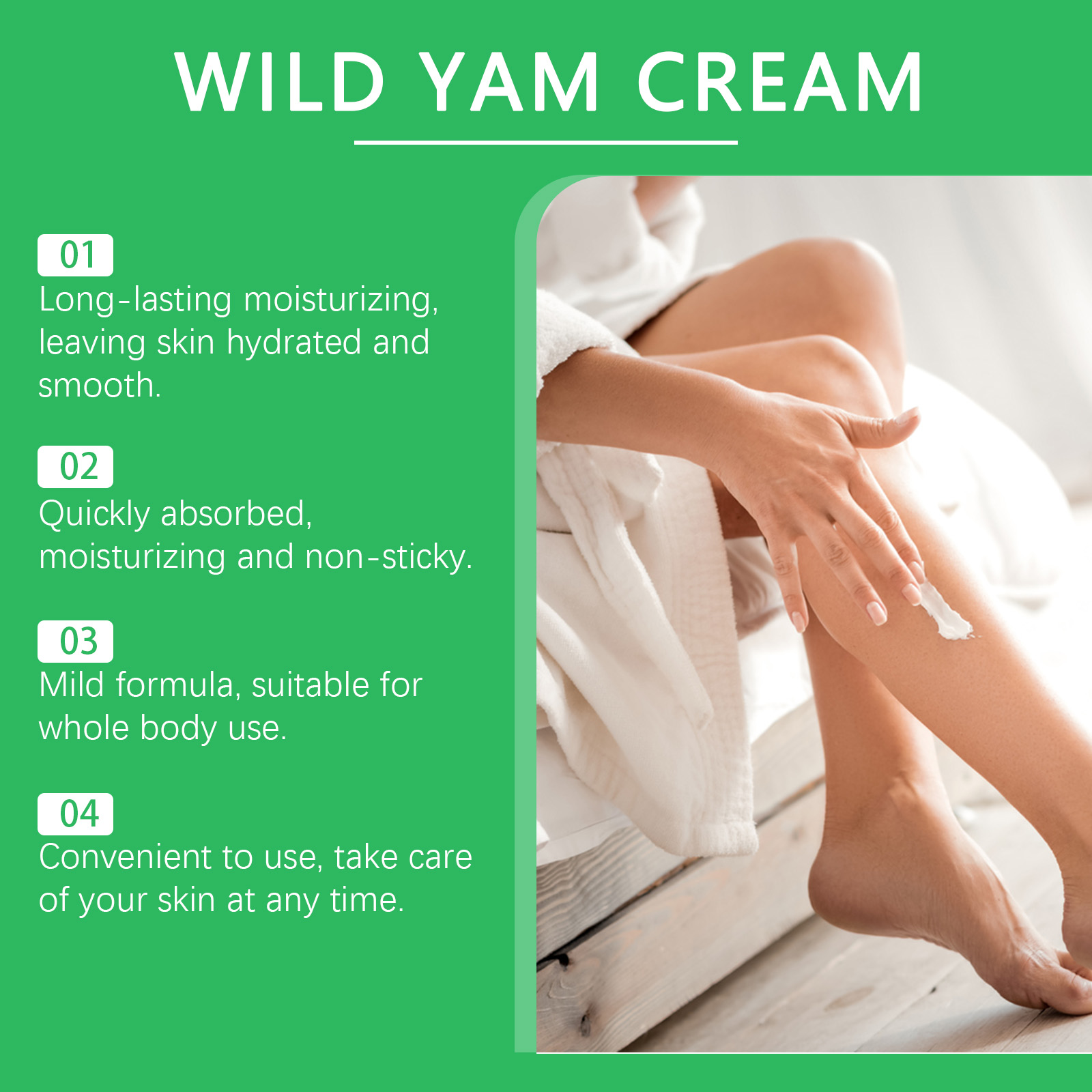 Our wild yam moisturizer contains wild yam root extract, beeswax and avocado oil. It can moisturize and repair the skin. Locks in moisture and increases skin glow. Nourish skin and improve skin softness. Its use method is very simple: 1. Clean the body skin, keep dry; 2. Apply appropriate amount of the product evenly to the required parts of the body; 3. Gently massage until completely absorbed. Deep moisturize skin, keep skin soft and smooth. Moisturize all day, no longer dry skin.
