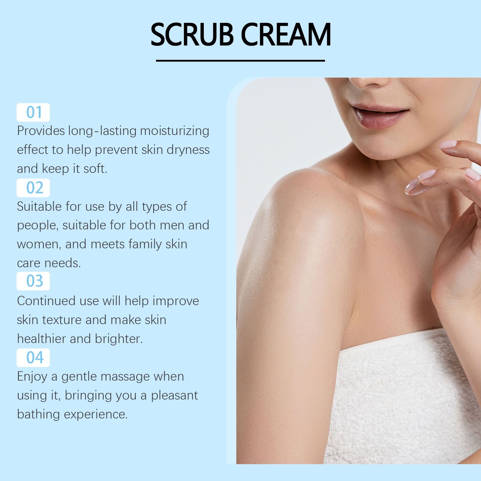Our exfoliating body scrubs contain sea salt, glycerin. It can help remove old dead skin cells and make the skin smoother and more transparent. Its use method is very simple: moisturize the body skin, apply appropriate amount of this product evenly on the body skin, gently massage in a circular motion for 3 minutes, and then wash off with clean water. And can deeply nourish the skin, keep the skin soft and elastic.