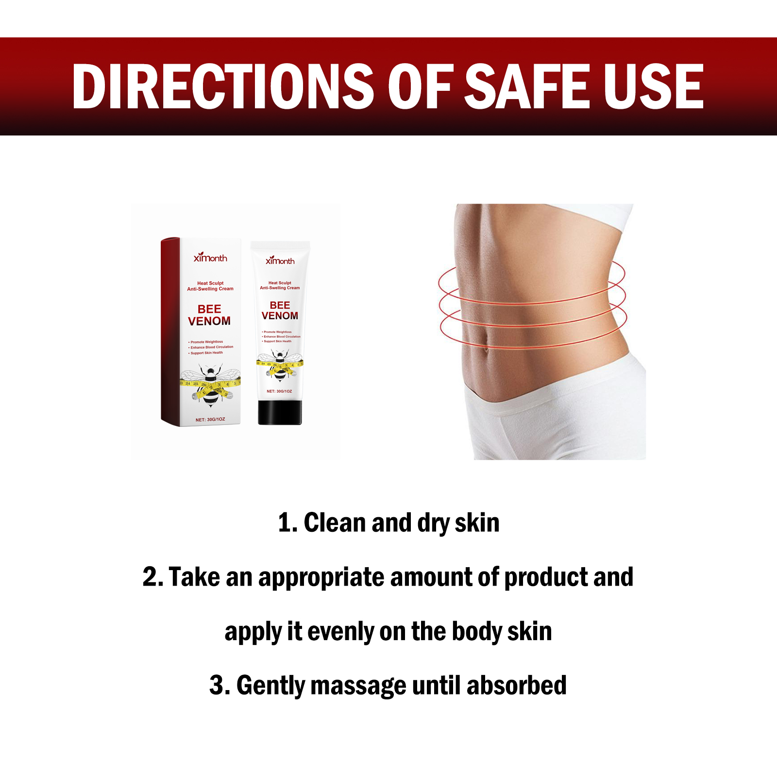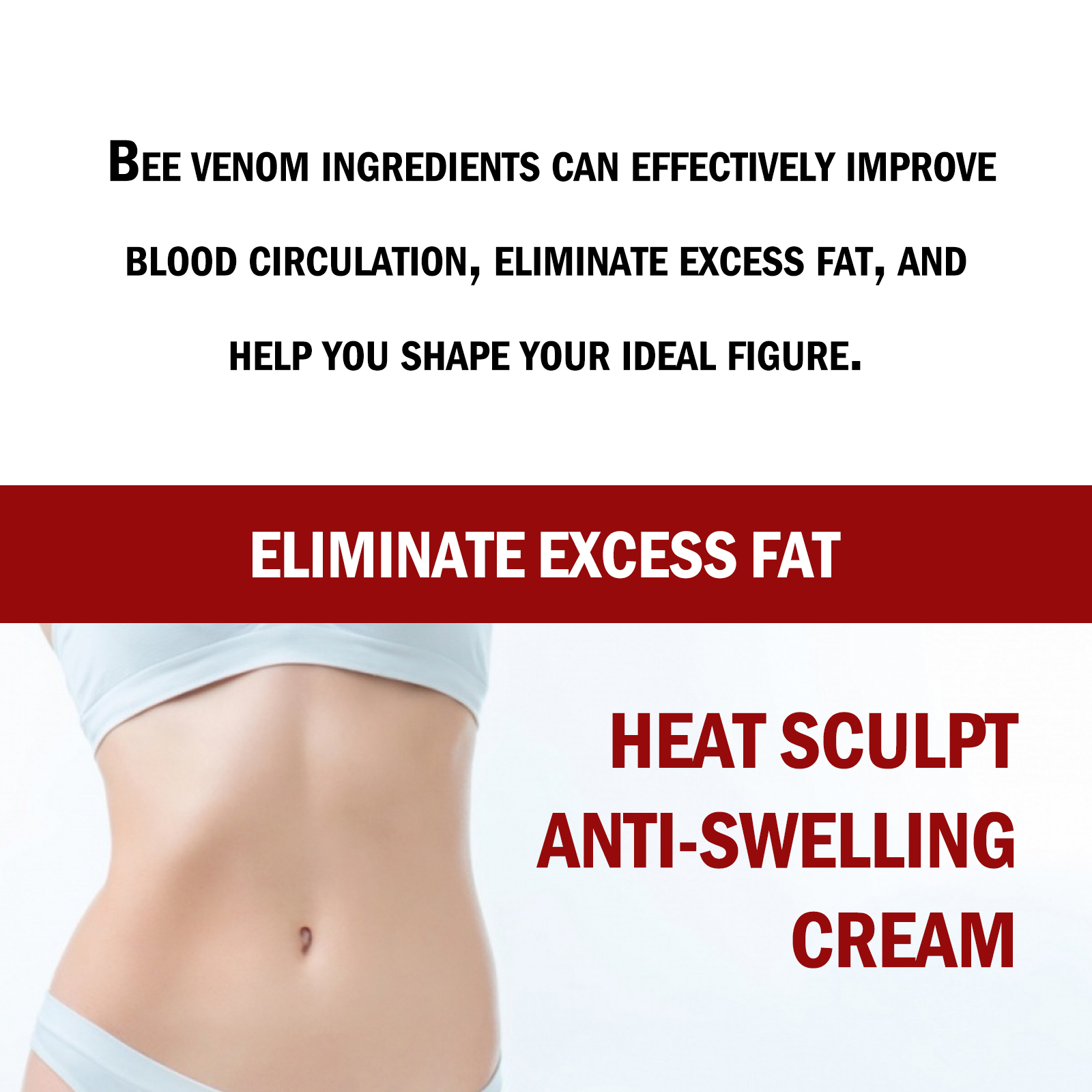 Our Heat Sculpt Anti-Swelling Cream contains Glycerin, Bee Venom, Tocopherol. It can effectively improve blood circulation, eliminate excess fat, help you shape the ideal body, can relax muscles, promote blood vessel dilation, reduce metabolic waste, make your skin more relaxed and less tight, can be more comfortable and free of movement. Its use method is very simple: clean and dry the skin, apply an appropriate amount of product evenly on the body skin, gently massage until absorbed. It can moisturize the skin, promote collagen production, provide skin elasticity, and make your skin healthier and glowing.