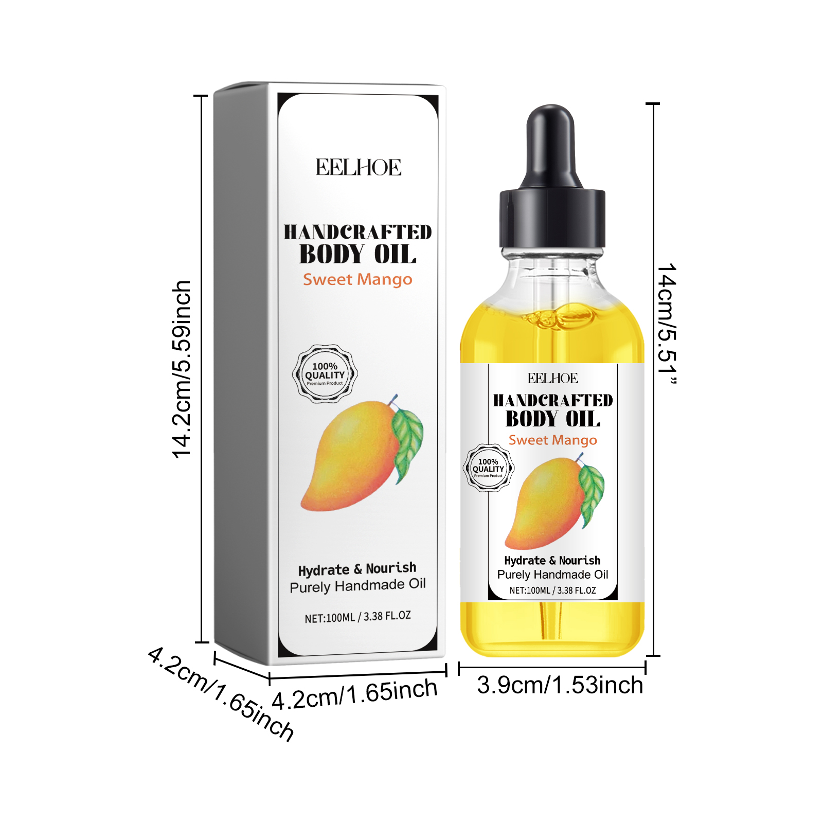 Our Handcrafted Body Oil contain Mangifera Indica (Mango) Fruit Extract, Simmondsia Chinensis (Jojoba)Seed Oil, Prunus Amygdalus Dulcis (Sweet Almond)Oil. It can effectively moisturize skin, improve dry skin, make skin smoother and softer, reverse signs of aging, and improve uneven skin tone, dry and aging skin. Its application method is very simple: clean and dry the skin, apply the appropriate amount of essential oil evenly on the body skin, gently massage until completely absorbed. It can improve dull skin, make your skin shine, add a variety of plant extracts, mild ingredients, suitable for all skin types.