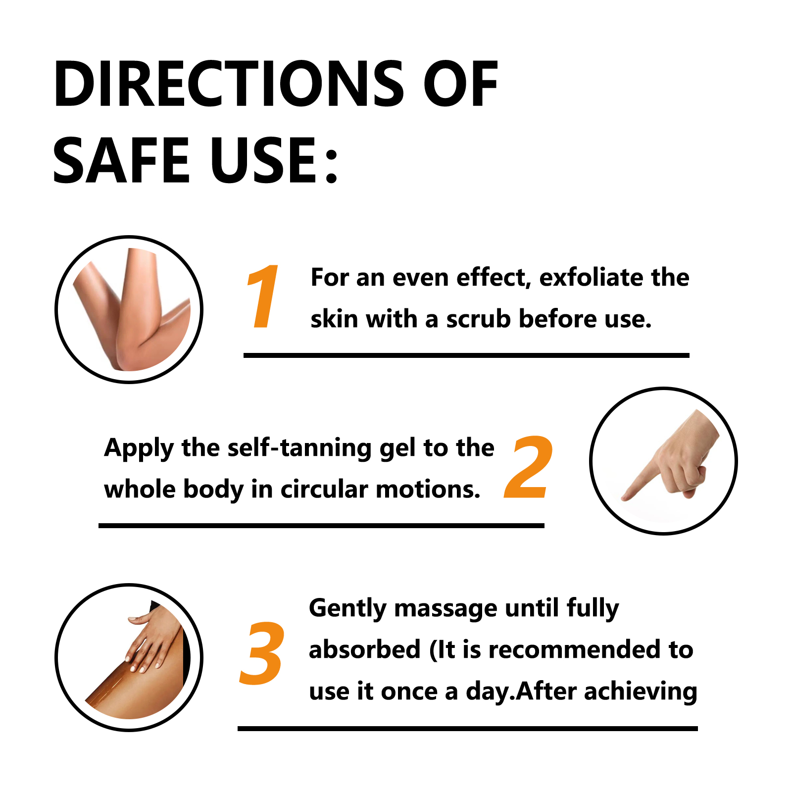 Our Intensive Tanning Gel contains Tocopherol, Calendula Officinalis Flower Extract, Daucus Carota Sativa (Carrot) Seed Oil. It achieves an even black effect and keeps your skin tanned and provides a long-lasting moisturizing effect that leaves skin soft and smooth. Its application is simple: For an even effect, exfoliate theskin with a scrub before use. Apply the self-tanning gel to thewhole body in circular motions. Gently massage until fully absorbed (lt is recommended to use it once a day. After achieving. Creates a natural summer tan that moisturizes and resists wrinkles, giving you an even tan.