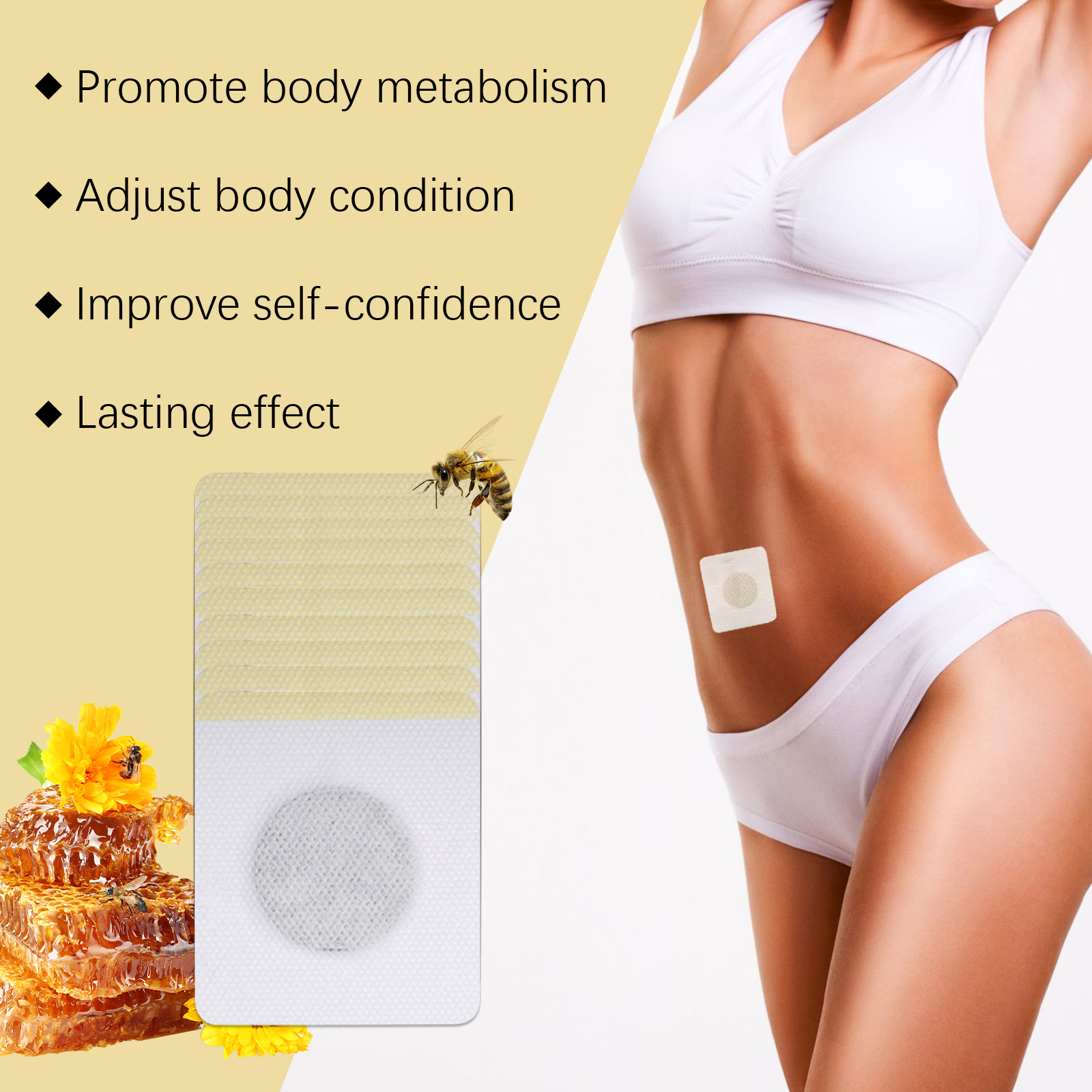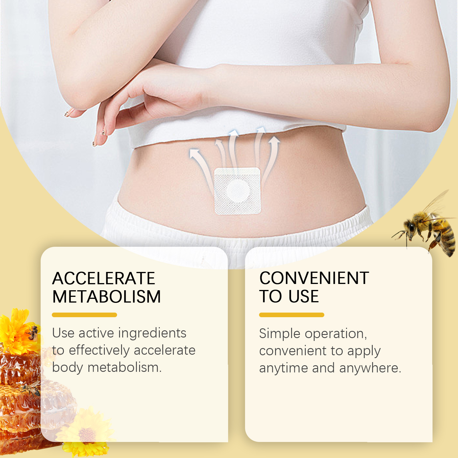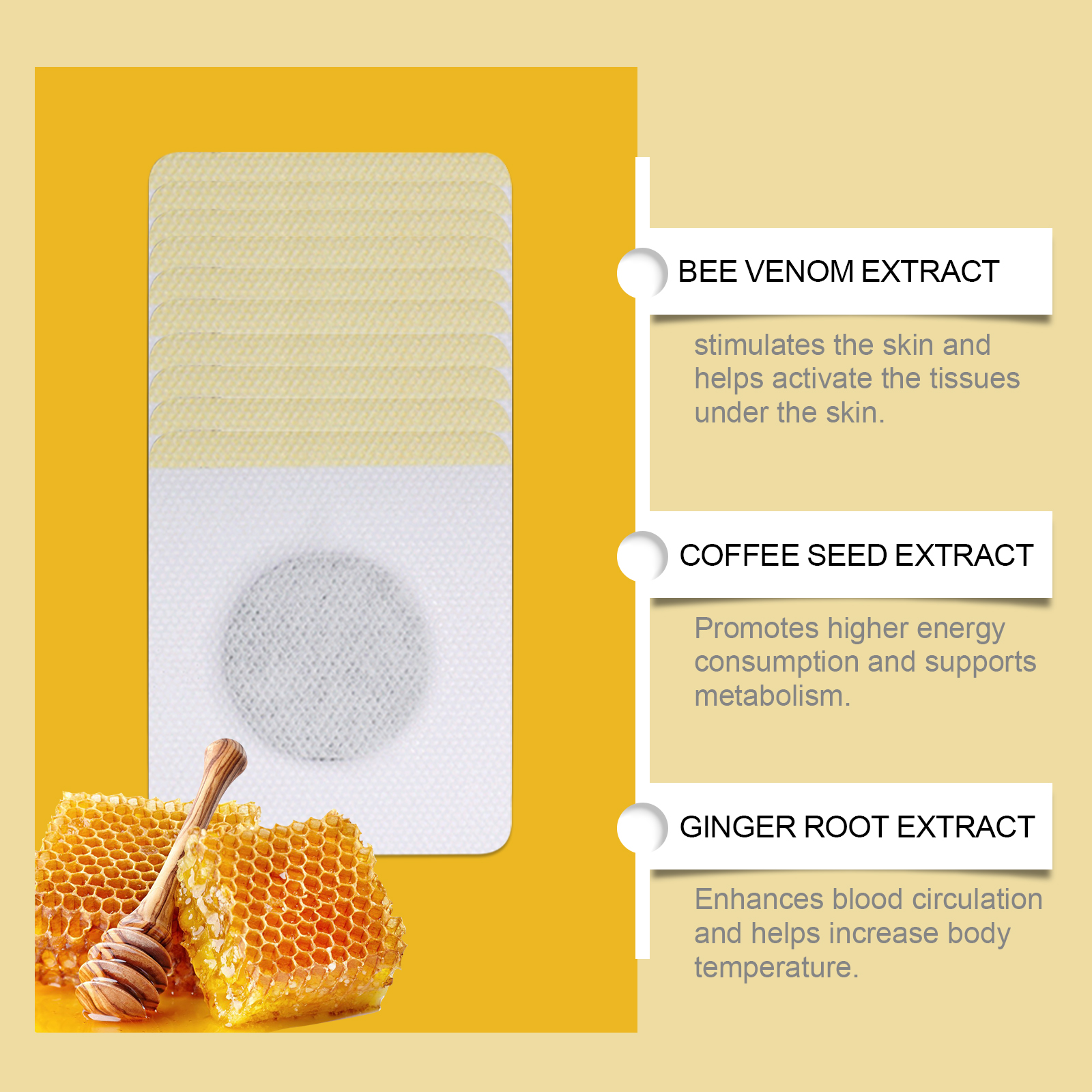 Our bee Venom slimming patch contains bee venom, coffee seed extract, ginger root extract. It can stimulate the skin and help activate the tissues under the skin. Promotes higher energy expenditure and supports metabolism. Improves blood circulation and helps raise body temperature. Its application method is simple: 1. Clean the skin around the belly button and keep it dry. 2. Take a patch and stick it on your belly button. 3. Let it sit for 8 hours, then remove the patch. Bee Venom Slimming patch uses active ingredients to effectively accelerate your body's metabolism. Easy to operate, easy to apply anytime, anywhere. Carefully formulated to suit all sensitive skin.