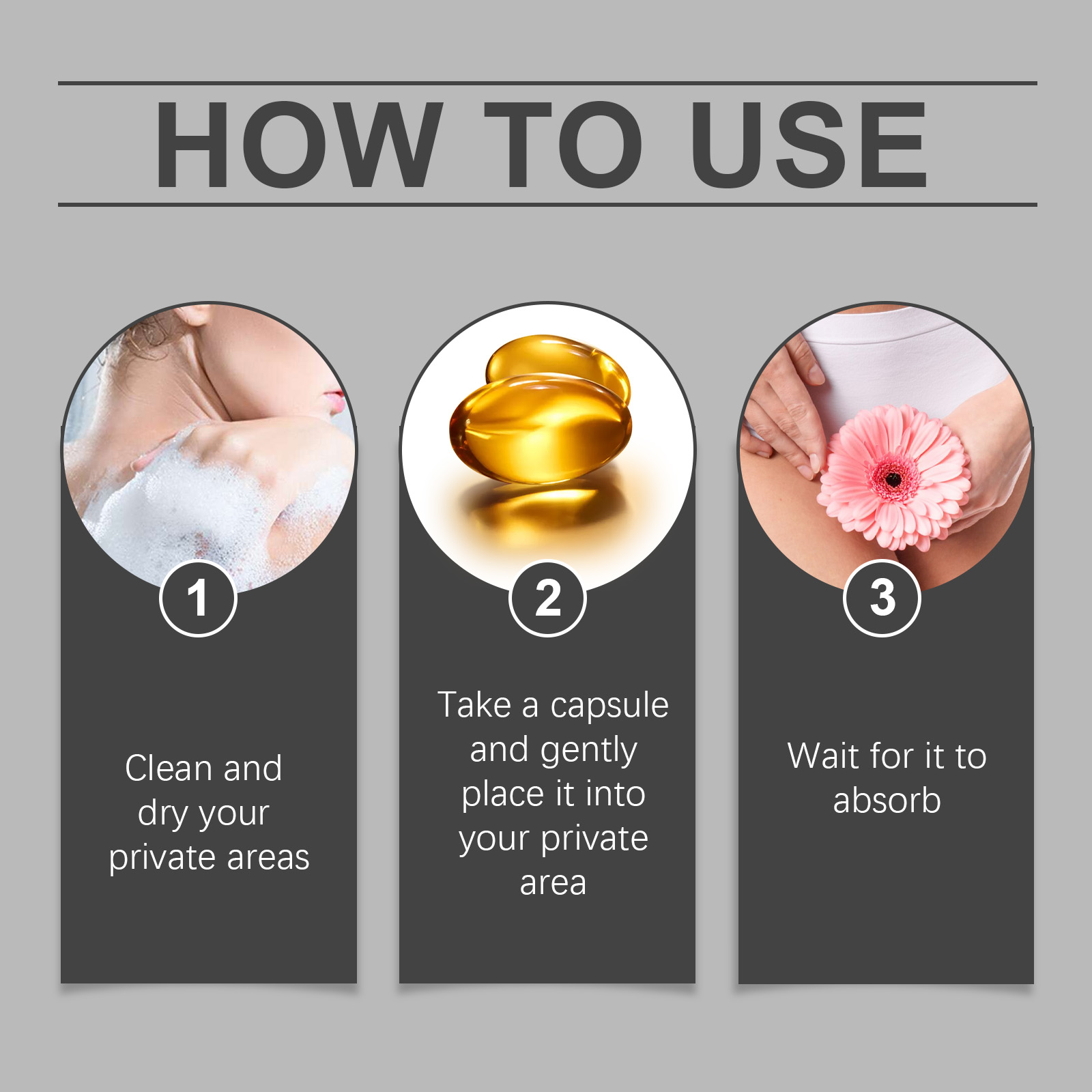Our natural healing capsules contain hyaluronic acid and glycerin. It provides long-lasting moisture for private areas. The way to use it is simple: clean and dry your private area, take a capsule and gently place it in your private area and wait for it to absorb. And can effectively relieve private discomfort.